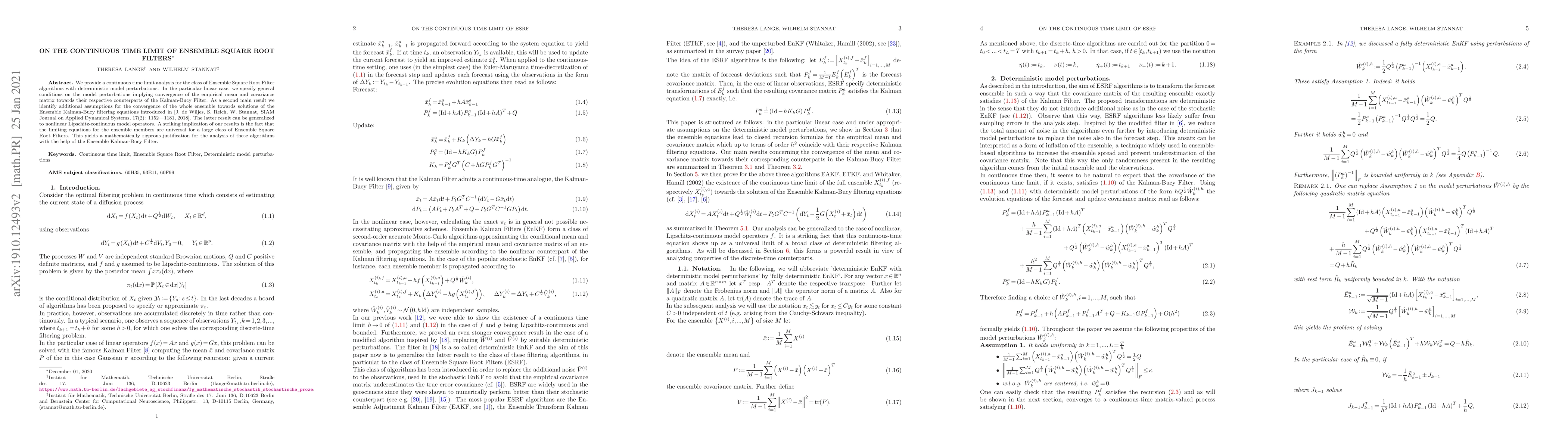 This paper analyzes the continuous time limit of Ensemble Square Root Filters, showing convergence conditions for the empirical mean and covariance matrix to the Kalman-Bucy Filter. It also generalizes these results to nonlinear systems and provides a rigorous justification for analyzing these algorithms using the Ensemble Kalman-Bucy Filter.