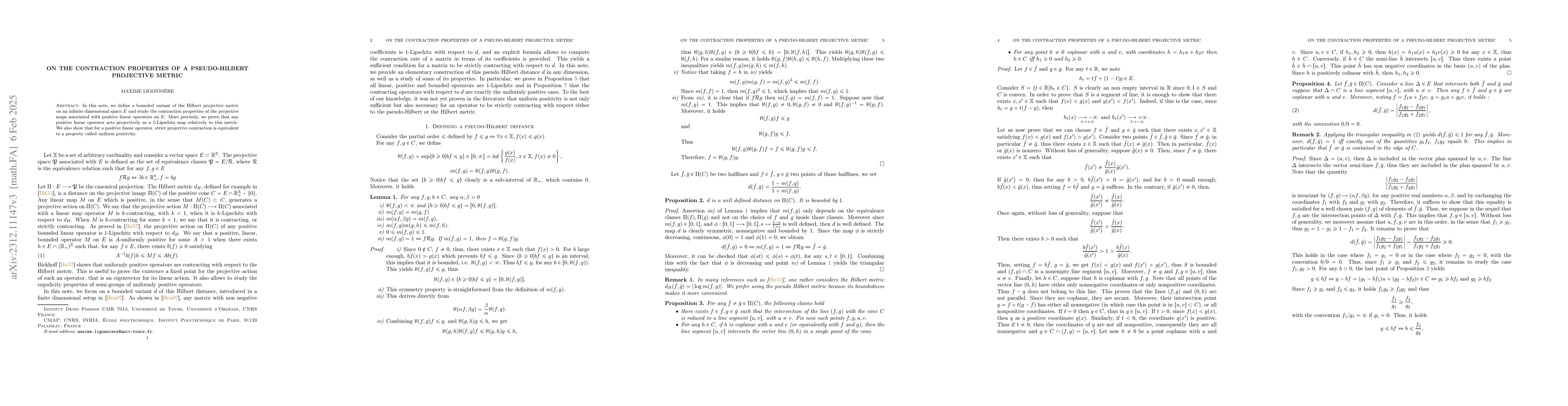 This paper introduces a bounded variant of the Hilbert projective metric in infinite dimensional spaces and demonstrates that positive linear operators act as 1-Lipschitz maps concerning this metric. It further establishes that strict projective contraction for such operators is equivalent to a condition termed uniform positivity.