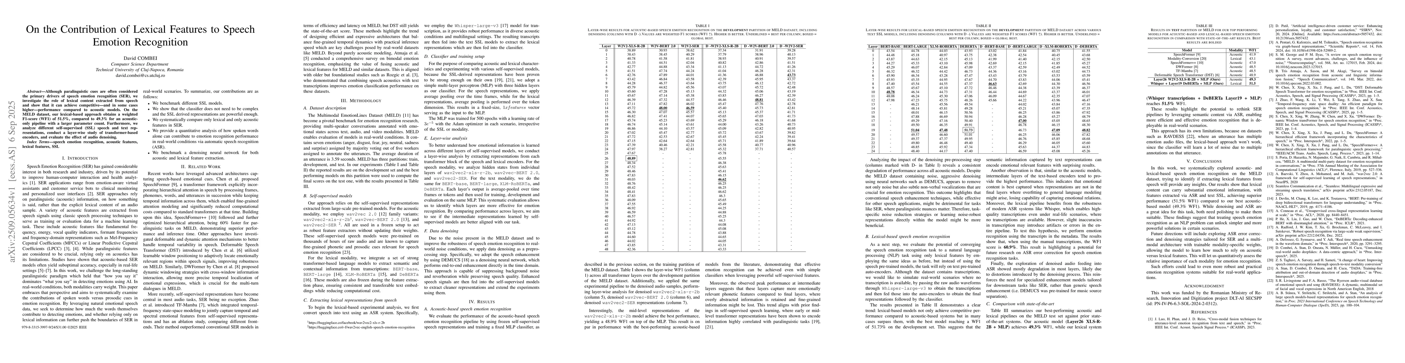 Although paralinguistic cues are often considered the primary drivers of speech emotion recognition (SER), we investigate the role of lexical content extracted from speech and show that it can achieve competitive and in some cases higher performance compared to acoustic models. On the MELD dataset, our lexical-based approach obtains a weighted F1-score (WF1) of 51.5%, compared to 49.3% for an acoustic-only pipeline with a larger parameter count. Furthermore, we analyze different self-supervised (SSL) speech and text representations, conduct a layer-wise study of transformer-based encoders, and evaluate the effect of audio denoising.