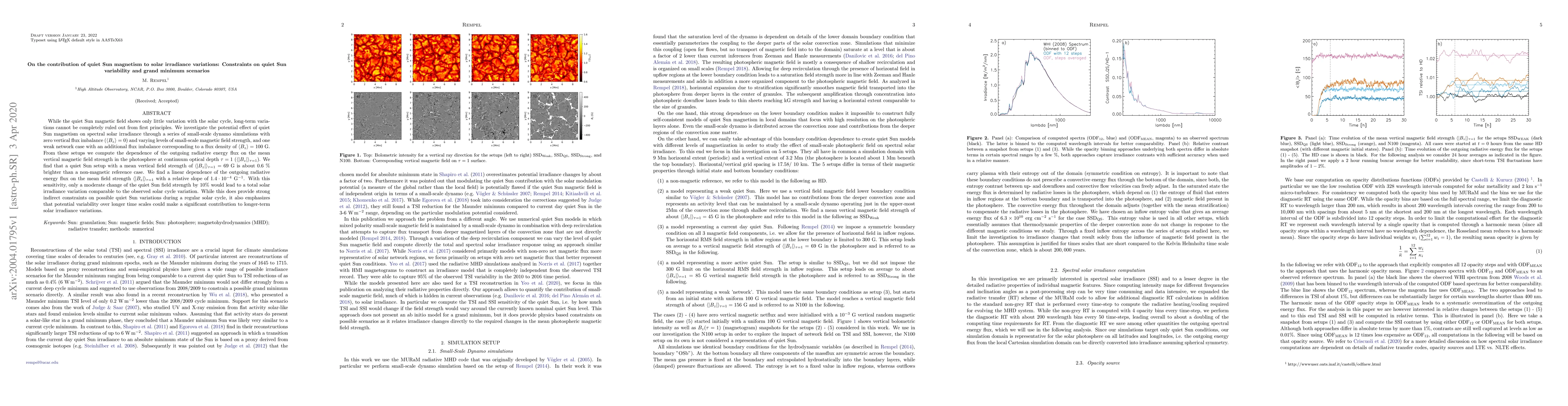 This paper investigates the impact of quiet Sun magnetism on solar irradiance variations, finding a linear relationship between mean vertical magnetic field strength and outgoing radiative energy flux. A moderate change in quiet Sun field strength could produce significant long-term solar irradiance variations, suggesting potential contributions to grand minimum scenarios.