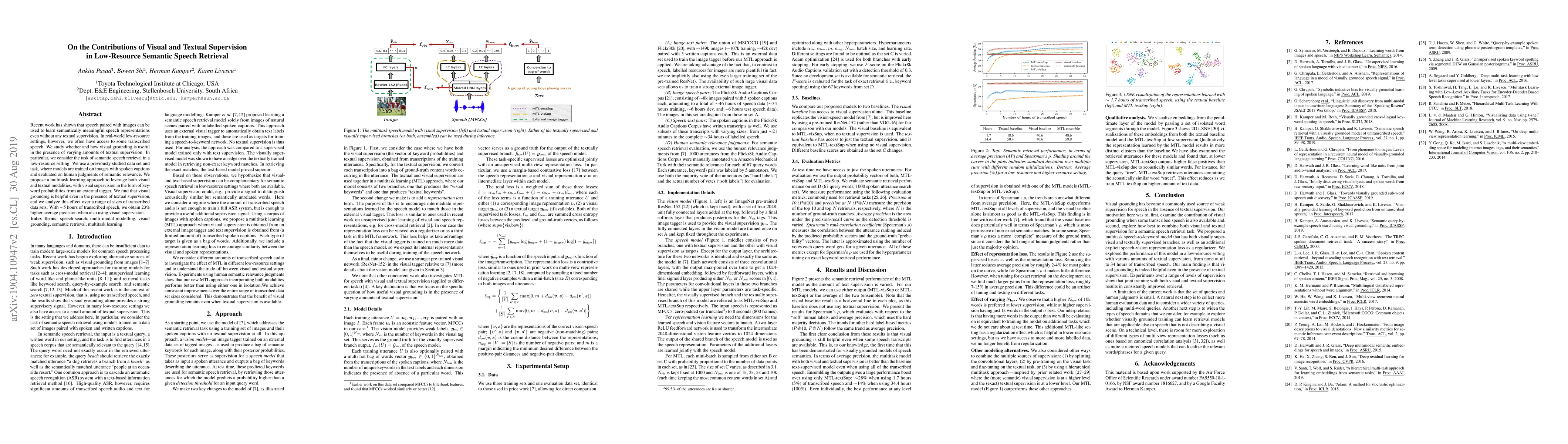This paper investigates the benefits of combining visual and textual supervision for low-resource semantic speech retrieval, finding that visual grounding enhances performance even when some transcribed speech is available. The study shows a 23% improvement in average precision with ~5 hours of transcribed data when visual supervision is used alongside textual supervision.
