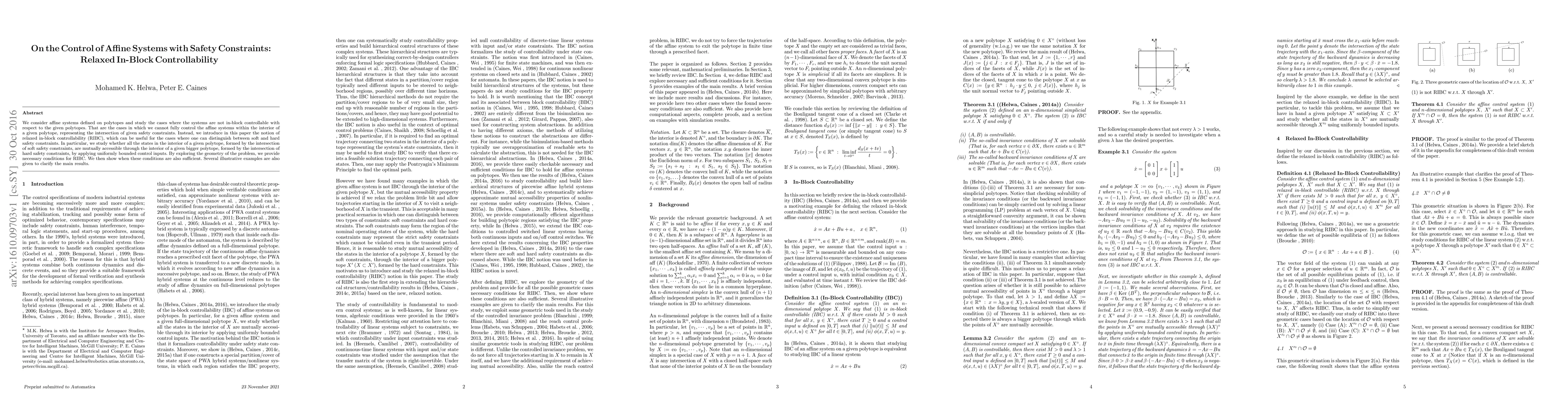 We consider affine systems defined on polytopes and study the cases where the systems are not in-block controllable with respect to the given polytopes. That are the cases in which we cannot fully control the affine systems within the interior of a given polytope, representing the intersection of given safety constraints. Instead, we introduce in this paper the notion of relaxed in-block controllability (RIBC), which can be useful for the cases where one can distinguish between soft and hard safety constraints. In particular, we study whether all the states in the interior of a given polytope, formed by the intersection of soft safety constraints, are mutually accessible through the interior of a given bigger polytope, formed by the intersection of hard safety constraints, by applying uniformly bounded control inputs. By exploring the geometry of the problem, we provide necessary conditions for RIBC. We then show when these conditions are also sufficient. Several illustrative examples are also given to clarify the main results.