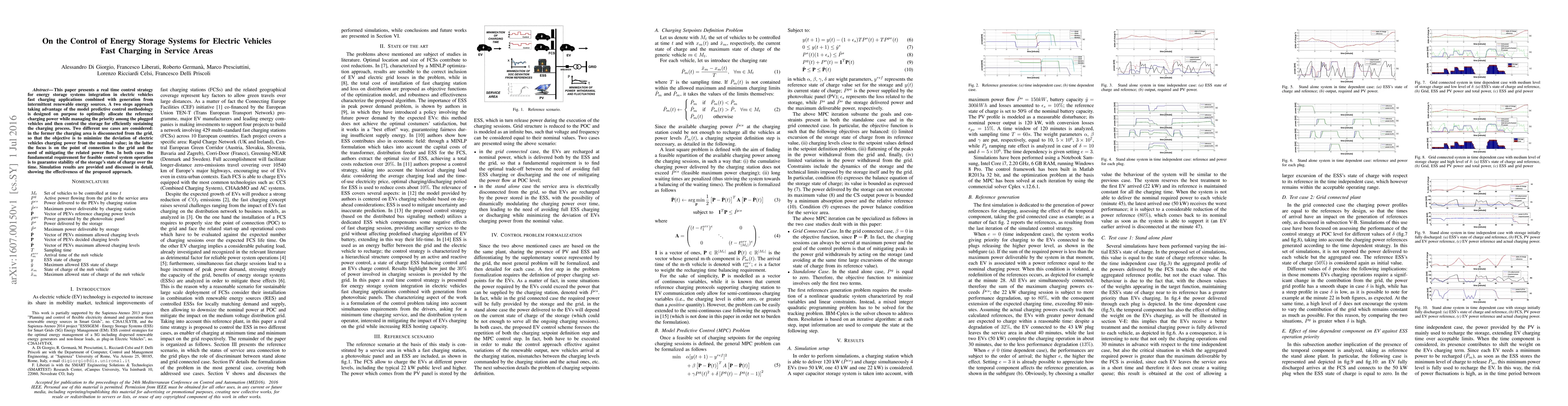 This paper presents a real time control strategy for energy storage systems integration in electric vehicles fast charging applications combined with generation from intermittent renewable energy sources. A two steps approach taking advantage of the model predictive control methodology is designed on purpose to optimally allocate the reference charging power while managing the priority among the plugged vehicles and then control the storage for efficiently sustaining the charging process. Two different use cases are considered: in the former the charging area is disconnected from the grid, so that the objective is to minimize the deviation of electric vehicles charging power from the nominal value; in the latter the focus is on the point of connection to the grid and the need of mitigating the related power flow. In both cases the fundamental requirement for feasible control system operation is to guarantee stability of the storage's state of charge over the time. Simulation results are provided and discussed in detail, showing the effectiveness of the proposed approach.