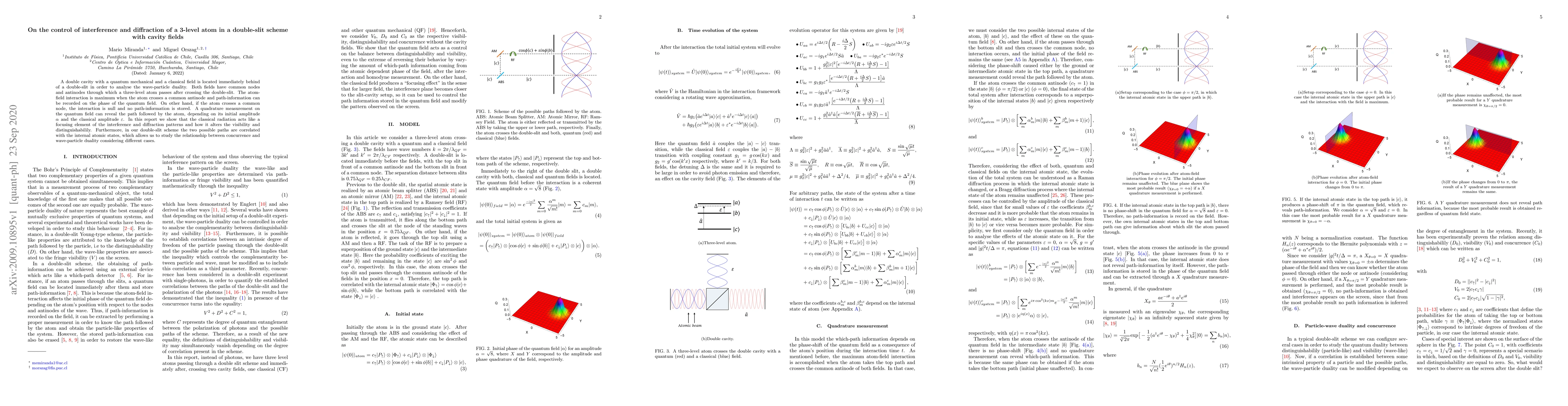 This paper investigates the interference and diffraction of a three-level atom passing through a double-slit, with a double cavity containing both quantum and classical fields behind it. The classical field acts as a focusing element, altering the visibility and distinguishability of the interference patterns, while the quantum field records path information based on the atom's interaction with nodes and antinodes.