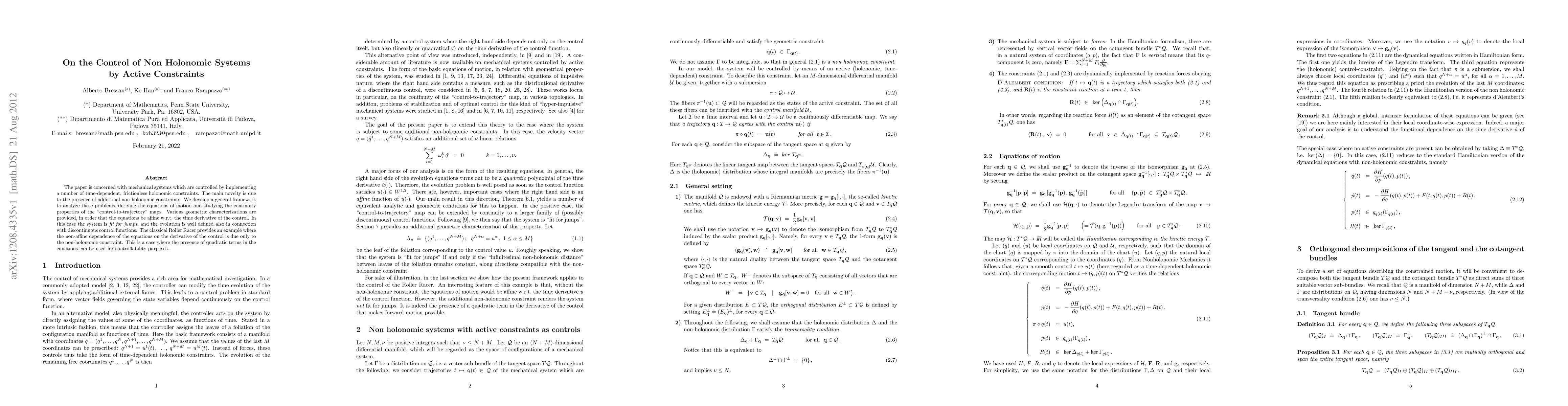 The paper is concerned with mechanical systems which are controlled by implementing a number of time-dependent, frictionless holonomic constraints. The main novelty is due to the presence of additional non-holonomic constraints. We develop a general framework to analyze these problems, deriving the equations of motion and studying the continuity properties of the "control-to-trajectory" maps. Various geometric characterizations are provided, in order that the equations be affine w.r.t. the time derivative of the control. In this case the system is fit for jumps, and the evolution is well defined also in connection with discontinuous control functions. The classical Roller Racer provides an example where the non-affine dependence of the equations on the derivative of the control is due only to the non-holonomic constraint. This is a case where the presence of quadratic terms in the equations can be used for controllability purposes.