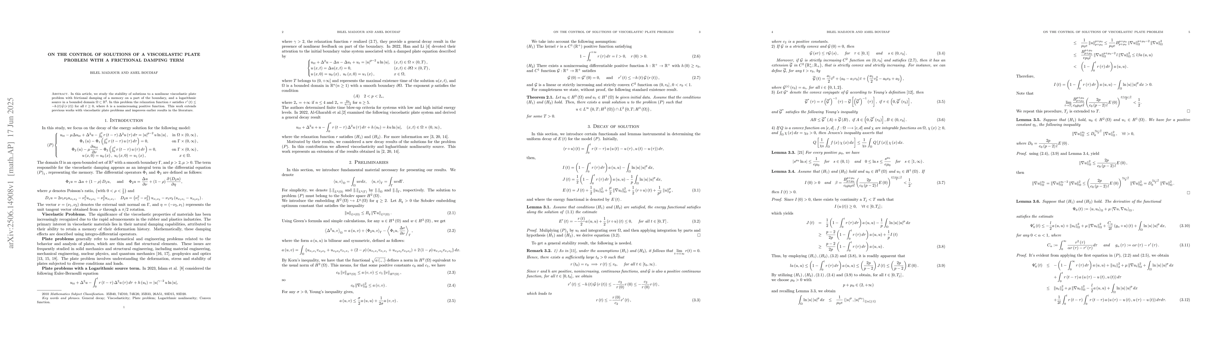 In this article, we study the stability of solutions to a nonlinear viscoelastic plate problem with frictional damping of a memory on a part of the boundary, and a logarithmic source in a bounded domain $\Omega \subset \mathbb{R}^2.$ In this problem the relaxation function $r$ satisfies $r^{\prime}\left( t\right)\leq -h\left( t\right) \mathcal{G}\left( r\left( t\right) \right)$ for all $t\geq 0$, where $h$ is a nonincreasing positive function. This work extends previous works with viscoelastic plate problems and improves earlier results in the