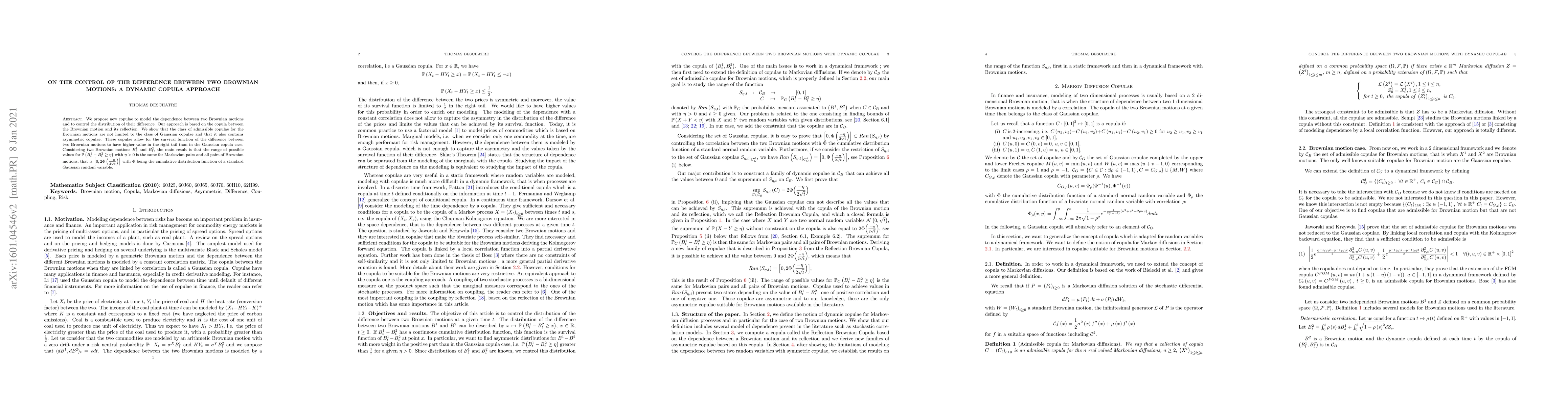 We propose new copulae to model the dependence between two Brownian motions and to control the distribution of their difference. Our approach is based on the copula between the Brownian motion and its reflection. We show that the class of admissible copulae for the Brownian motions are not limited to the class of Gaussian copulae and that it also contains asymmetric copulae. These copulae allow for the survival function of the difference between two Brownian motions to have higher value in the right tail than in the Gaussian copula case. Considering two Brownian motions $B_t^1$ and $B_t^2$, the main result is that the range of possible values for $\mathbb{P}\left(B_t^1-B^2_t \geq \eta\right)$ with $\eta > 0$ is the same for Markovian pairs and all pairs of Brownian motions, that is $\left[0,2\Phi\left(\frac{-\eta}{2\sqrt{t}}\right)\right]$ with $\Phi$ being the cumulative distribution function of a standard Gaussian random variable.