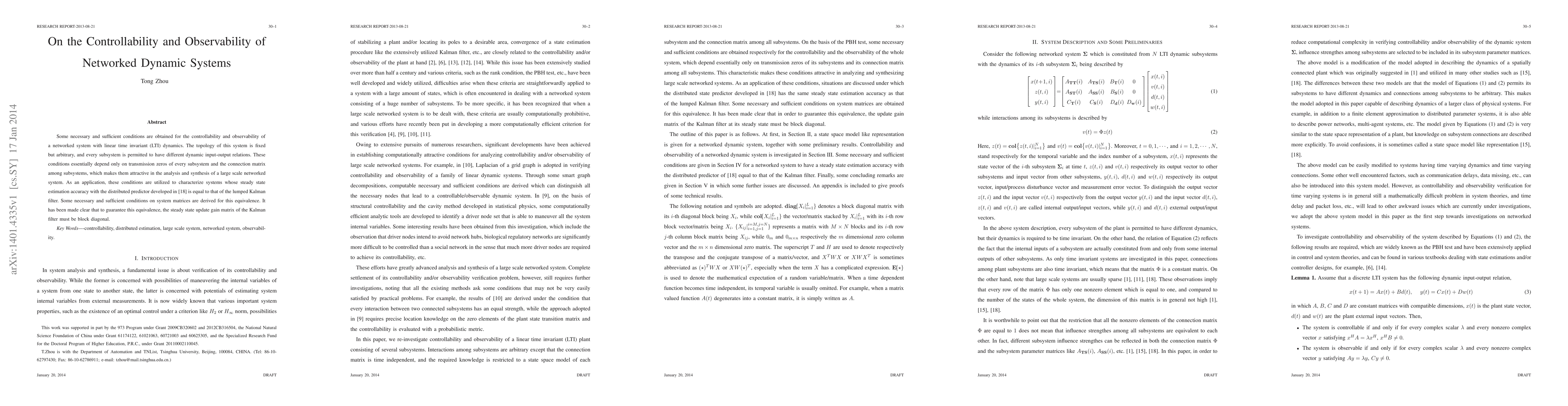 Some necessary and sufficient conditions are obtained for the controllability and observability of a networked system with linear time invariant (LTI) dynamics. The topology of this system is fixed but arbitrary, and every subsystem is permitted to have different dynamic input-output relations. These conditions essentially depend only on transmission zeros of every subsystem and the connection matrix among subsystems, which makes them attractive in the analysis and synthesis of a large scale networked system. As an application, these conditions are utilized to characterize systems whose steady state estimation accuracy with the distributed predictor developed in (Zhou, 2013) is equal to that of the lumped Kalman filter. Some necessary and sufficient conditions on system matrices are derived for this equivalence. It has been made clear that to guarantee this equivalence, the steady state update gain matrix of the Kalman filter must be block diagonal.