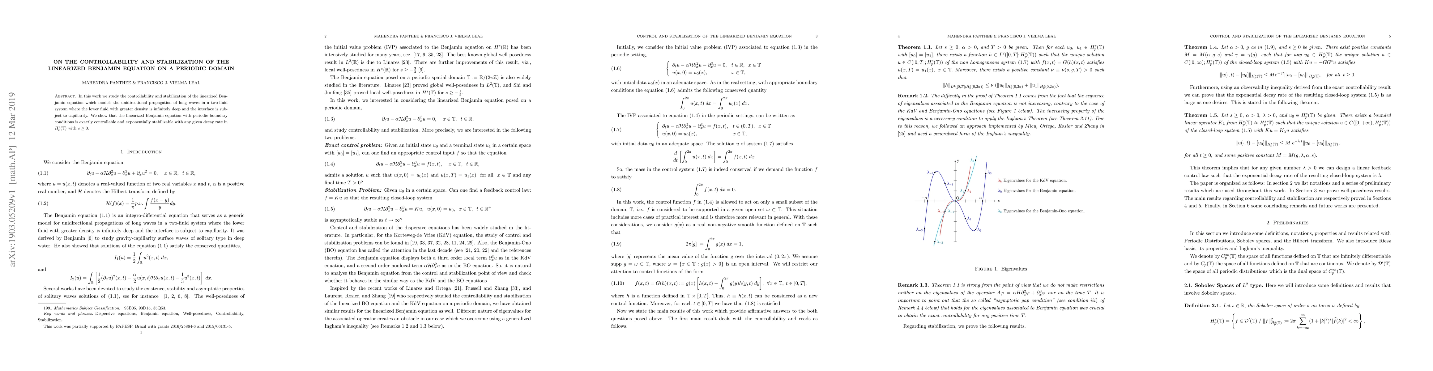 This paper investigates the controllability and stabilization of the linearized Benjamin equation, which describes the propagation of long waves in a two-fluid system. The study demonstrates exact controllability and exponential stabilization with any decay rate for periodic boundary conditions in the function space $H_{p}^{s}(\mathbb{T})$ for $s \geq 0$.