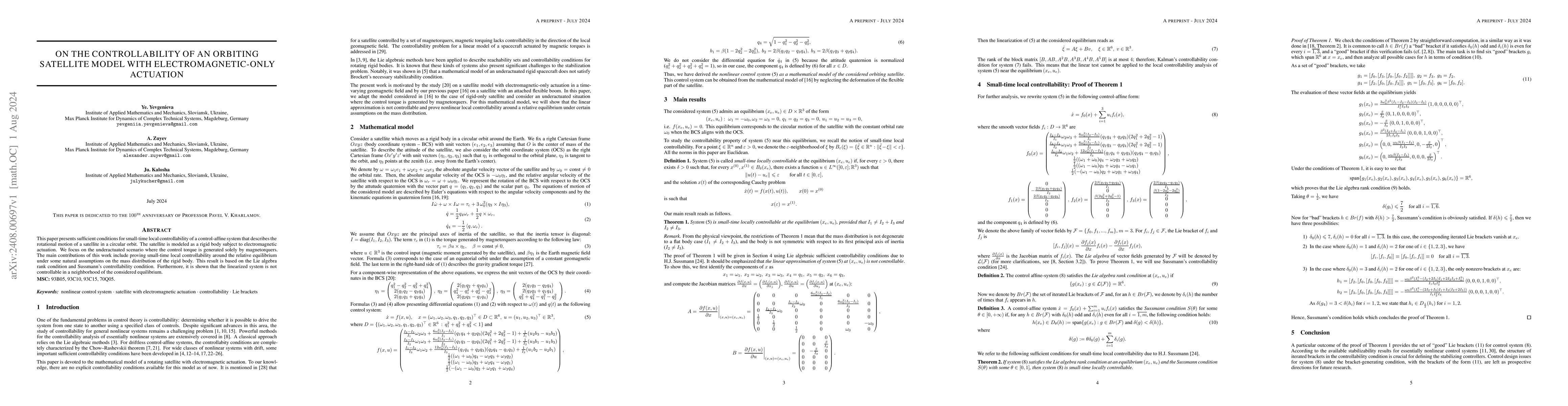 This paper establishes sufficient conditions for small-time local controllability of a satellite model driven solely by electromagnetic actuation, proving that despite the underactuated nature and non-controllability of the linearized system, the system can still be controlled under certain mass distribution assumptions using the Lie algebra rank condition and Sussmann's controllability criterion.