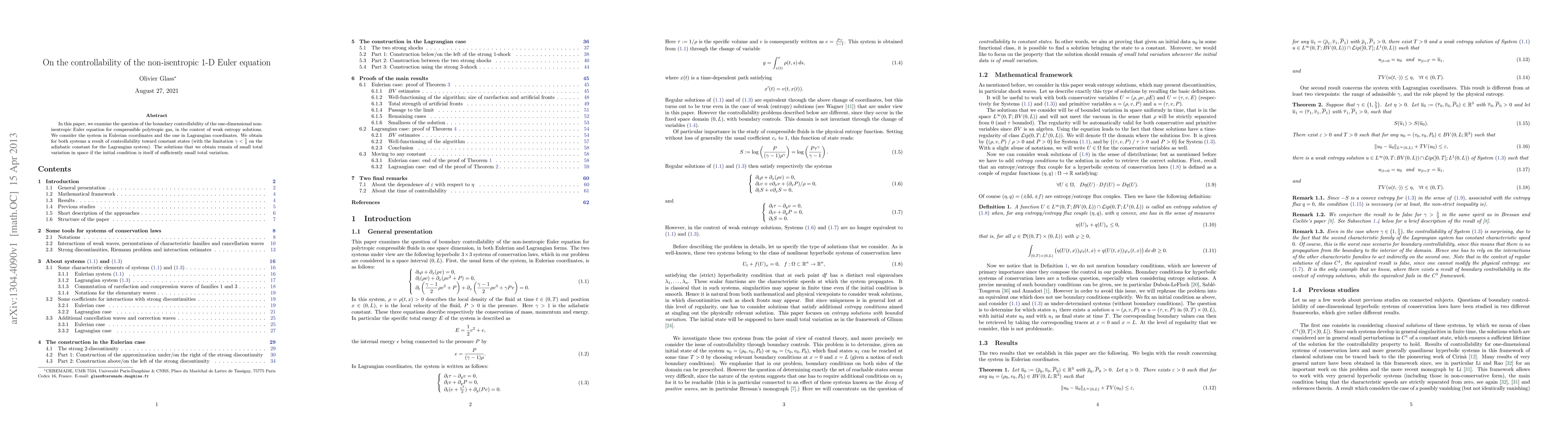 The paper investigates the controllability of a 1-D Euler equation for compressible gases in both Eulerian and Lagrangian coordinates, finding that solutions can be controlled to constant states under certain conditions.