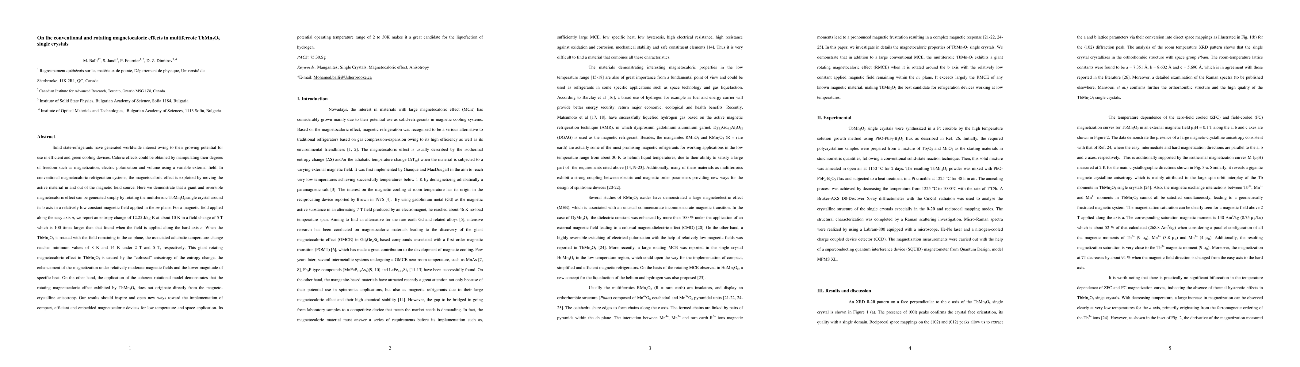 This paper demonstrates a giant and reversible magnetocaloric effect in TbMn2O5 single crystals by rotating them in a low magnetic field, achieving an entropy change of 12.25 J/kg K at 10 K. This rotating magnetocaloric effect, driven by the material's colossal anisotropy, could lead to compact, efficient cooling devices for low-temperature applications.