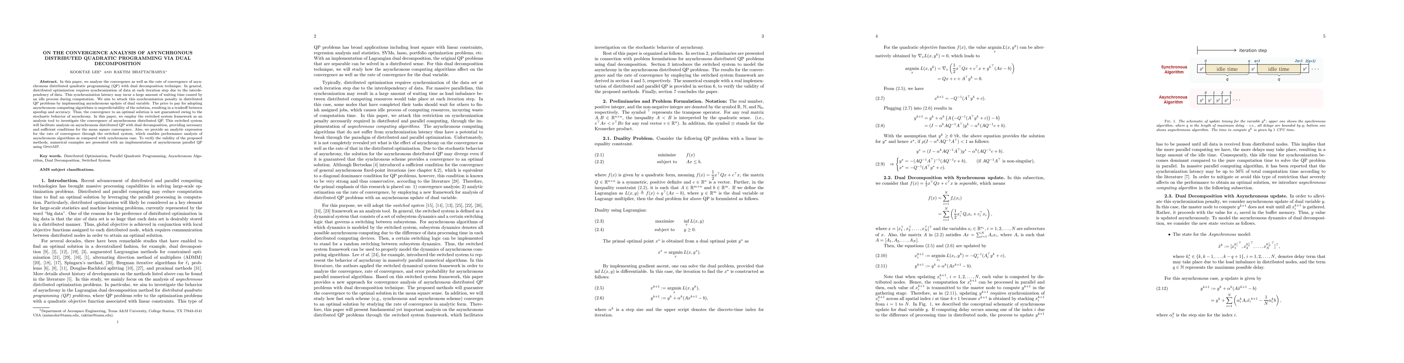 In this paper, we analyze the convergence as well as the rate of convergence of asynchronous distributed quadratic programming (QP) with dual decomposition technique. In general, distributed optimization requires synchronization of data at each iteration step due to the interdependency of data. This synchronization latency may incur a large amount of waiting time caused by an idle process during computation. We aim to attack this synchronization penalty in distributed QP problems by implementing asynchronous update of dual variable. The price to pay for adopting asynchronous computing algorithms is unpredictability of the solution, resulting in a tradeoff between speedup and accuracy. Thus, the convergence to an optimal solution is not guaranteed owing to the stochastic behavior of asynchrony. In this paper, we employ the switched system framework as an analysis tool to investigate the convergence of asynchronous distributed QP. This switched system will facilitate analysis on asynchronous distributed QP with dual decomposition, providing necessary and sufficient conditions for the mean square convergence. Also, we provide an analytic expression for the rate of convergence through the switched system, which enables performance analysis of asynchronous algorithms as compared with synchronous case. To verify the validity of the proposed methods, numerical examples are presented with an implementation of asynchronous parallel QP using OpenMP.