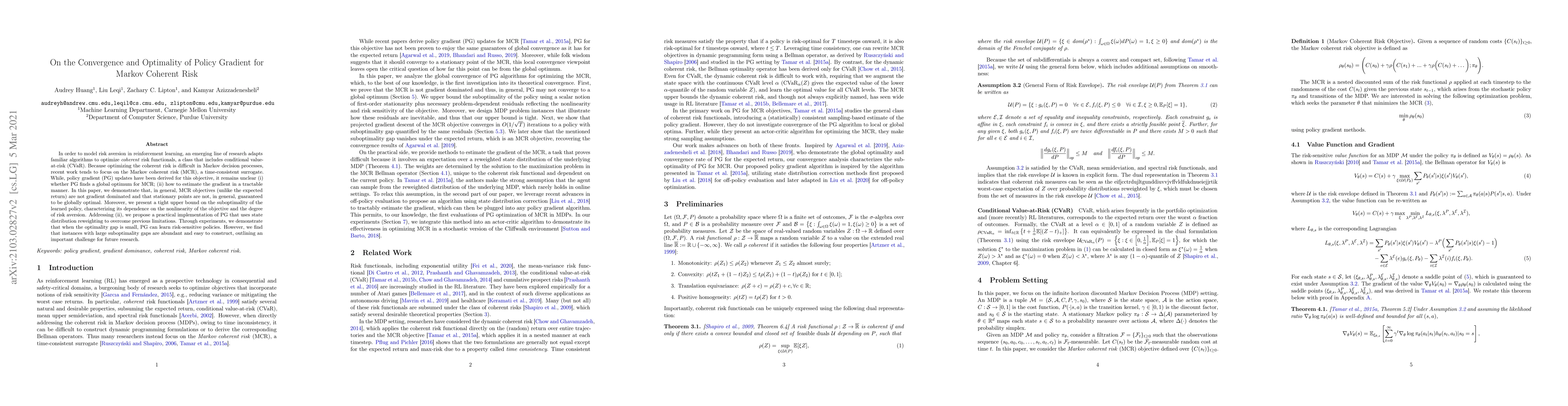 In order to model risk aversion in reinforcement learning, an emerging line of research adapts familiar algorithms to optimize coherent risk functionals, a class that includes conditional value-at-risk (CVaR). Because optimizing the coherent risk is difficult in Markov decision processes, recent work tends to focus on the Markov coherent risk (MCR), a time-consistent surrogate. While, policy gradient (PG) updates have been derived for this objective, it remains unclear (i) whether PG finds a global optimum for MCR; (ii) how to estimate the gradient in a tractable manner. In this paper, we demonstrate that, in general, MCR objectives (unlike the expected return) are not gradient dominated and that stationary points are not, in general, guaranteed to be globally optimal. Moreover, we present a tight upper bound on the suboptimality of the learned policy, characterizing its dependence on the nonlinearity of the objective and the degree of risk aversion. Addressing (ii), we propose a practical implementation of PG that uses state distribution reweighting to overcome previous limitations. Through experiments, we demonstrate that when the optimality gap is small, PG can learn risk-sensitive policies. However, we find that instances with large suboptimality gaps are abundant and easy to construct, outlining an important challenge for future research.