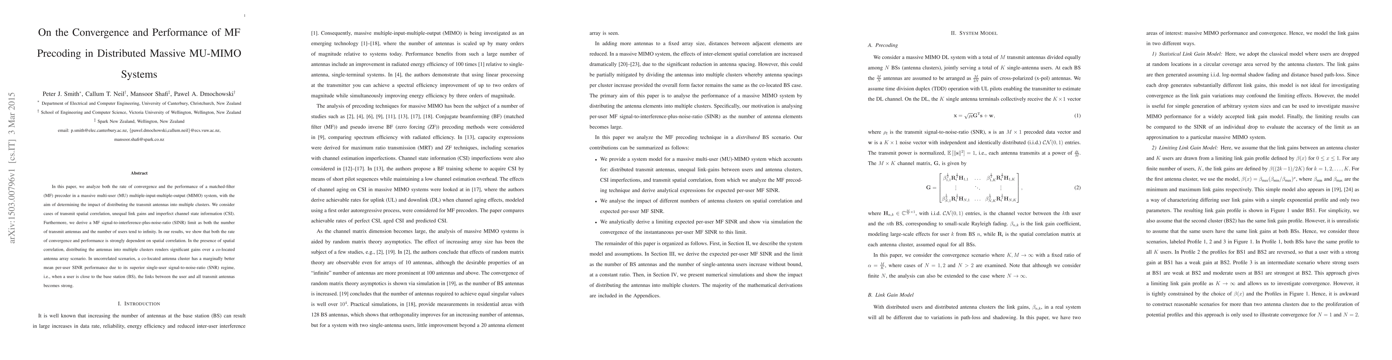 In this paper, we analyze both the rate of convergence and the performance of a matched-filter (MF) precoder in a massive multi-user (MU) multiple-input-multiple-output (MIMO) system, with the aim of determining the impact of distributing the transmit antennas into multiple clusters. We consider cases of transmit spatial correlation, unequal link gains and imperfect channel state information (CSI). Furthermore, we derive a MF signal-to-interference-plus-noise-ratio (SINR) limit as both the number of transmit antennas and the number of users tend to infinity. In our results, we show that both the rate of convergence and performance is strongly dependent on spatial correlation. In the presence of spatial correlation, distributing the antennas into multiple clusters renders significant gains over a co-located antenna array scenario. In uncorrelated scenarios, a co-located antenna cluster has a marginally better mean per-user SINR performance due to its superior single-user signal-to-noise-ratio (SNR) regime, i.e., when a user is close to the base station (BS), the links between the user and all transmit antennas becomes strong.