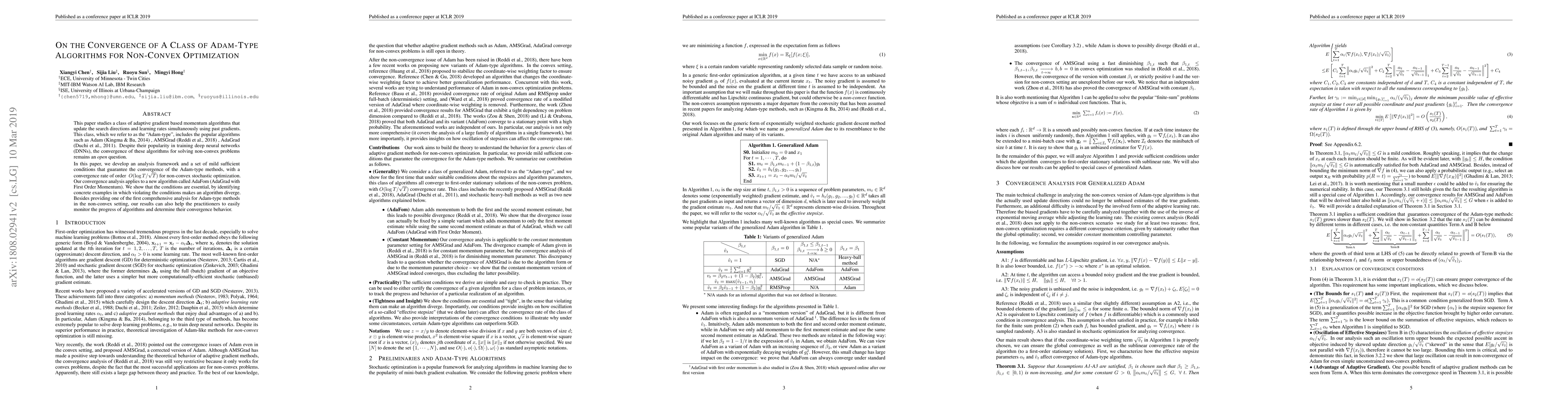This paper studies a class of adaptive gradient based momentum algorithms that update the search directions and learning rates simultaneously using past gradients. This class, which we refer to as the "Adam-type", includes the popular algorithms such as the Adam, AMSGrad and AdaGrad. Despite their popularity in training deep neural networks, the convergence of these algorithms for solving nonconvex problems remains an open question. This paper provides a set of mild sufficient conditions that guarantee the convergence for the Adam-type methods. We prove that under our derived conditions, these methods can achieve the convergence rate of order $O(\log{T}/\sqrt{T})$ for nonconvex stochastic optimization. We show the conditions are essential in the sense that violating them may make the algorithm diverge. Moreover, we propose and analyze a class of (deterministic) incremental adaptive gradient algorithms, which has the same $O(\log{T}/\sqrt{T})$ convergence rate. Our study could also be extended to a broader class of adaptive gradient methods in machine learning and optimization.