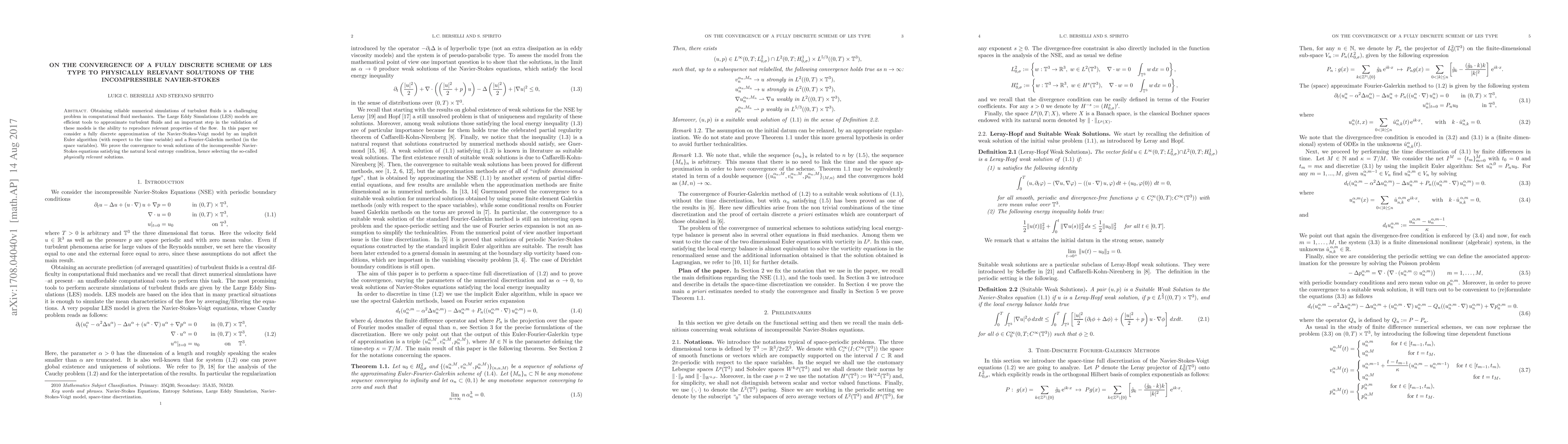 Obtaining reliable numerical simulations of turbulent fluids is a challenging problem in computational fluid mechanics. The Large Eddy Simulations (LES) models are efficient tools to approximate turbulent fluids and an important step in the validation of these models is the ability to reproduce relevant properties of the flow. In this paper we consider a fully discrete approximation of the Navier-Stokes-Voigt model by an implicit Euler algorithm (with respect to the time variable) and a Fourier-Galerkin method (in the space variables). We prove the convergence to weak solutions of the incompressible Navier-Stokes equations satisfying the natural local entropy condition, hence selecting the so-called physically relevant solutions