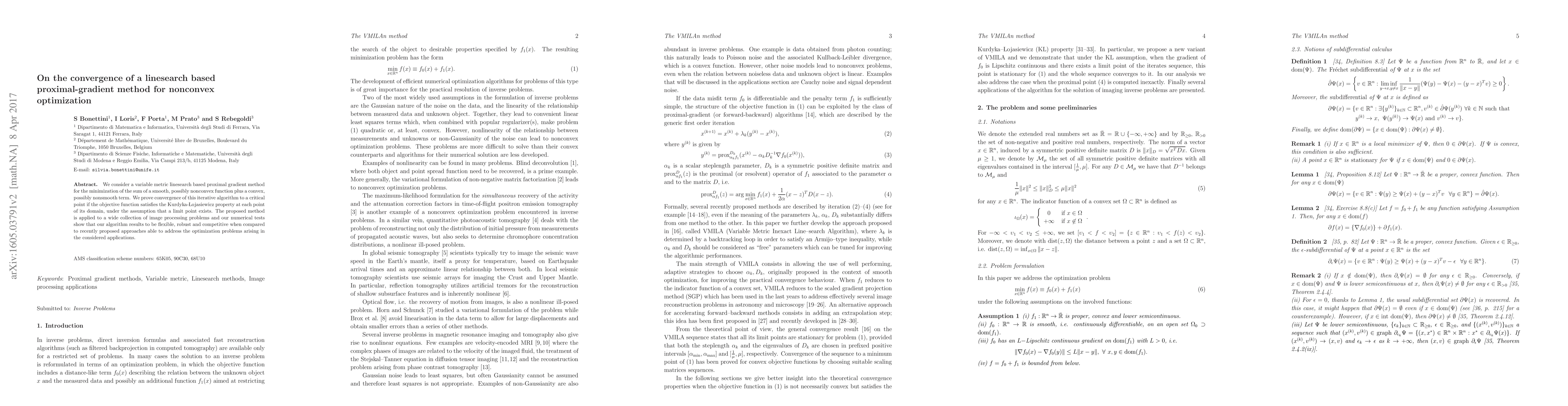 We consider a variable metric linesearch based proximal gradient method for the minimization of the sum of a smooth, possibly nonconvex function plus a convex, possibly nonsmooth term. We prove convergence of this iterative algorithm to a critical point if the objective function satisfies the Kurdyka-Lojasiewicz property at each point of its domain, under the assumption that a limit point exists. The proposed method is applied to a wide collection of image processing problems and our numerical tests show that our algorithm results to be flexible, robust and competitive when compared to recently proposed approaches able to address the optimization problems arising in the considered applications.