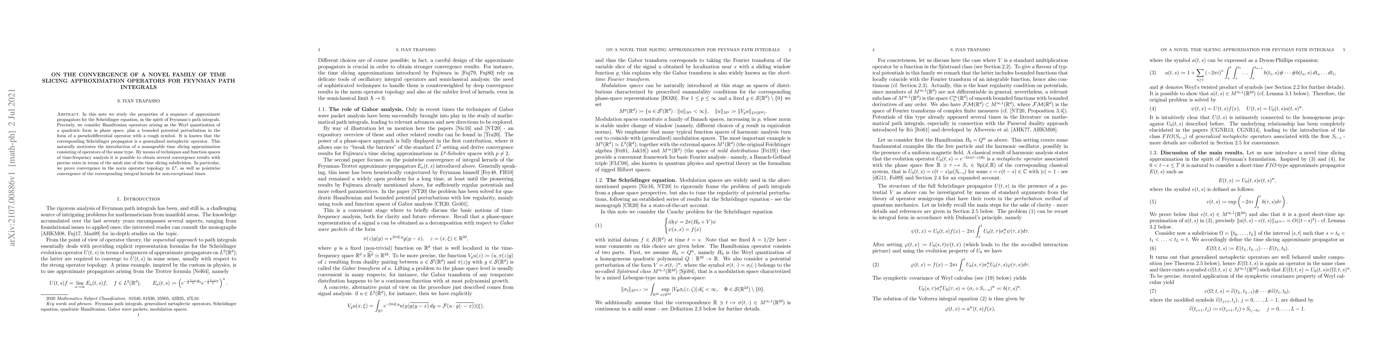 This paper investigates a sequence of time slicing approximation operators for Feynman path integrals applied to the Schrödinger equation. It demonstrates convergence results in $L^2$ norm and pointwise convergence of integral kernels, using techniques from time-frequency analysis.