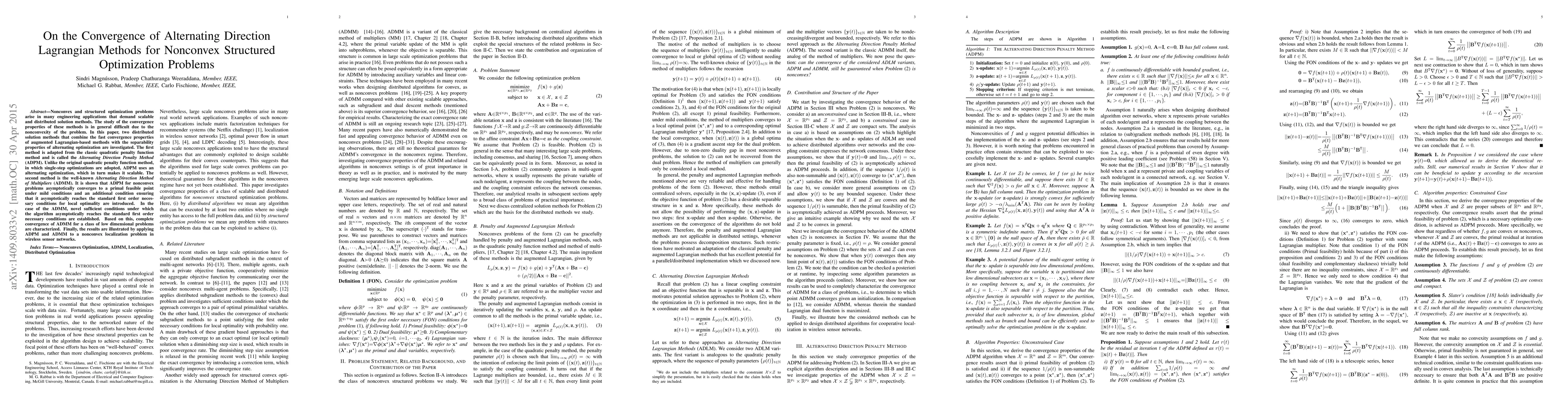 Nonconvex and structured optimization problems arise in many engineering applications that demand scalable and distributed solution methods. The study of the convergence properties of these methods is in general difficult due to the nonconvexity of the problem. In this paper, two distributed solution methods that combine the fast convergence properties of augmented Lagrangian-based methods with the separability properties of alternating optimization are investigated. The first method is adapted from the classic quadratic penalty function method and is called the Alternating Direction Penalty Method (ADPM). Unlike the original quadratic penalty function method, in which single-step optimizations are adopted, ADPM uses an alternating optimization, which in turn makes it scalable. The second method is the well-known Alternating Direction Method of Multipliers (ADMM). It is shown that ADPM for nonconvex problems asymptotically converges to a primal feasible point under mild conditions and an additional condition ensuring that it asymptotically reaches the standard first order necessary conditions for local optimality are introduced. In the case of the ADMM, novel sufficient conditions under which the algorithm asymptotically reaches the standard first order necessary conditions are established. Based on this, complete convergence of ADMM for a class of low dimensional problems are characterized. Finally, the results are illustrated by applying ADPM and ADMM to a nonconvex localization problem in wireless sensor networks.