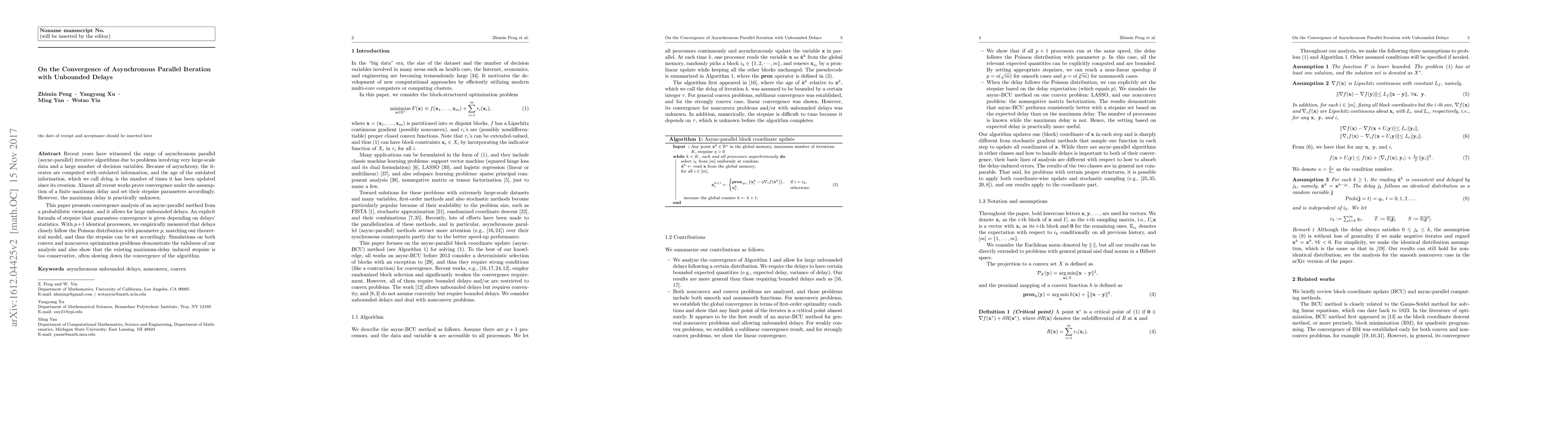 Recent years have witnessed the surge of asynchronous parallel (async-parallel) iterative algorithms due to problems involving very large-scale data and a large number of decision variables. Because of asynchrony, the iterates are computed with outdated information, and the age of the outdated information, which we call delay, is the number of times it has been updated since its creation. Almost all recent works prove convergence under the assumption of a finite maximum delay and set their stepsize parameters accordingly. However, the maximum delay is practically unknown. This paper presents convergence analysis of an async-parallel method from a probabilistic viewpoint, and it allows for large unbounded delays. An explicit formula of stepsize that guarantees convergence is given depending on delays' statistics. With $p+1$ identical processors, we empirically measured that delays closely follow the Poisson distribution with parameter $p$, matching our theoretical model, and thus the stepsize can be set accordingly. Simulations on both convex and nonconvex optimization problems demonstrate the validness of our analysis and also show that the existing maximum-delay induced stepsize is too conservative, often slowing down the convergence of the algorithm.