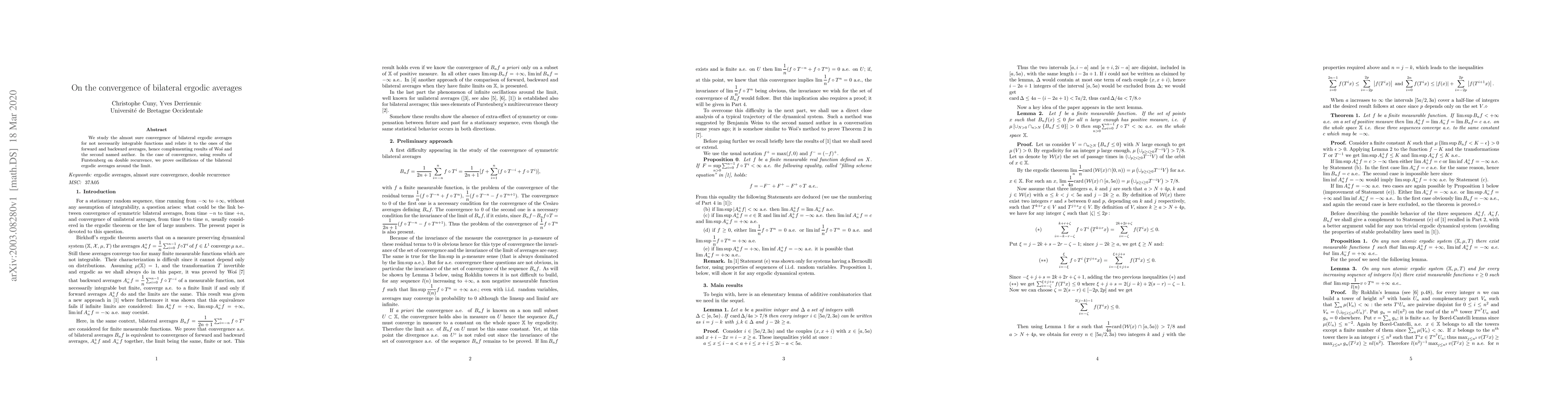 This paper investigates the almost sure convergence of bilateral ergodic averages for non-integrable functions, comparing it with the convergence of forward and backward averages. It proves oscillations of the averages around the limit when convergence occurs, utilizing Furstenberg's double recurrence results.