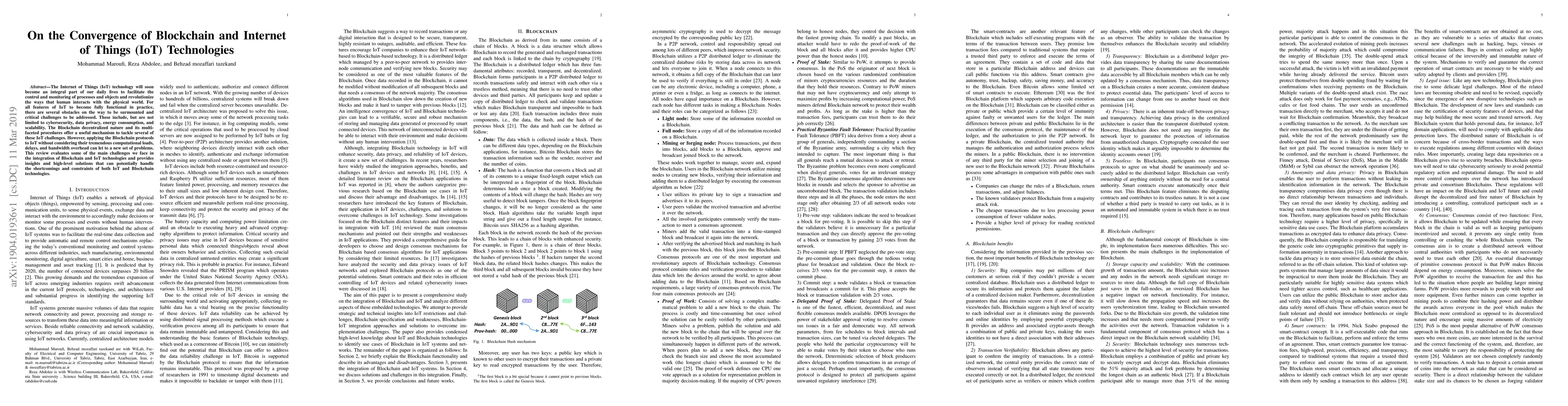 This paper explores the integration of Blockchain and IoT technologies to address IoT's challenges like cybersecurity and scalability. It highlights the potential of Blockchain's decentralized nature but also warns of the computational and bandwidth issues arising from its application to IoT.