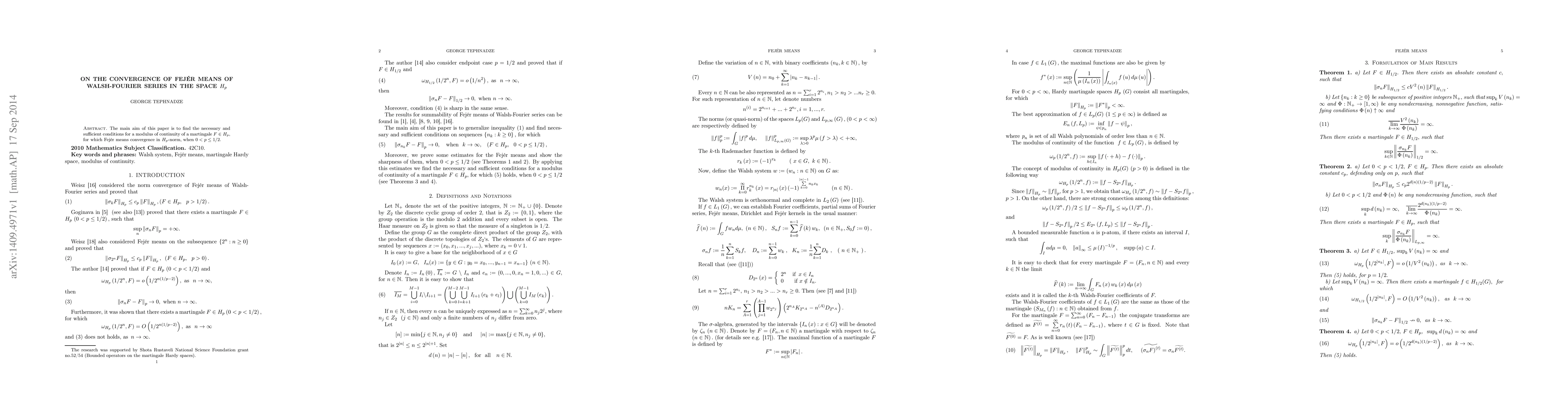 The main aim of this paper is to find the necessary and sufficient conditions for a modulus of continuity of a martingale $F\in H_{p},$ for which Fej\'er means convergence in $H_{p}$-norm, when $0