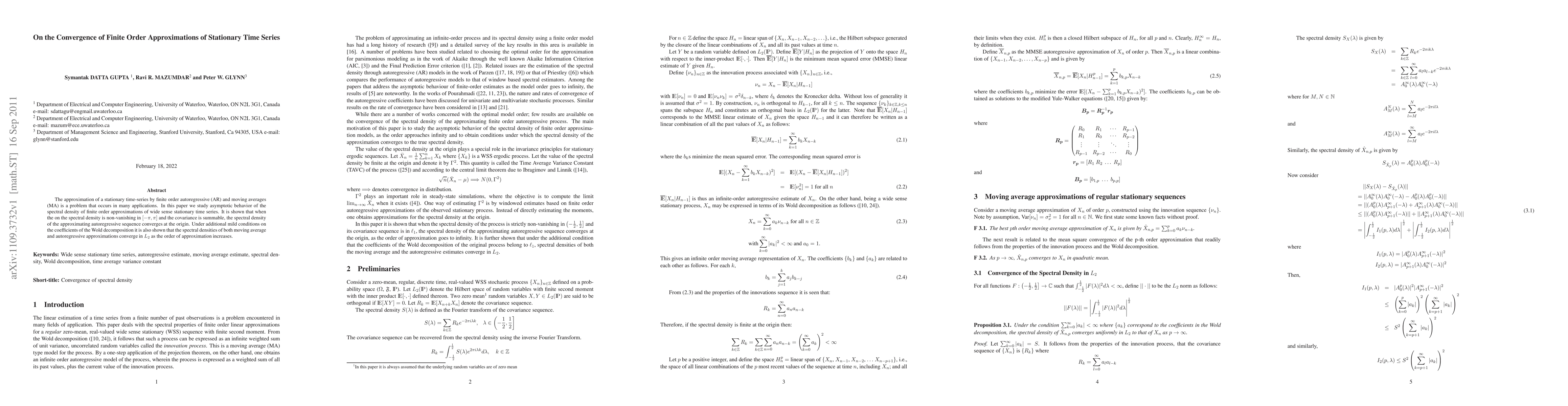 The approximation of a stationary time-series by finite order autoregressive (AR) and moving averages (MA) is a problem that occurs in many applications. In this paper we study asymptotic behavior of the spectral density of finite order approximations of wide sense stationary time series. It is shown that when the on the spectral density is non-vanishing in $[-\pi,\pi]$ and the covariance is summable, the spectral density of the approximating autoregressive sequence converges at the origin. Under additional mild conditions on the coefficients of the Wold decomposition it is also shown that the spectral densities of both moving average and autoregressive approximations converge in $L_2$ as the order of approximation increases.