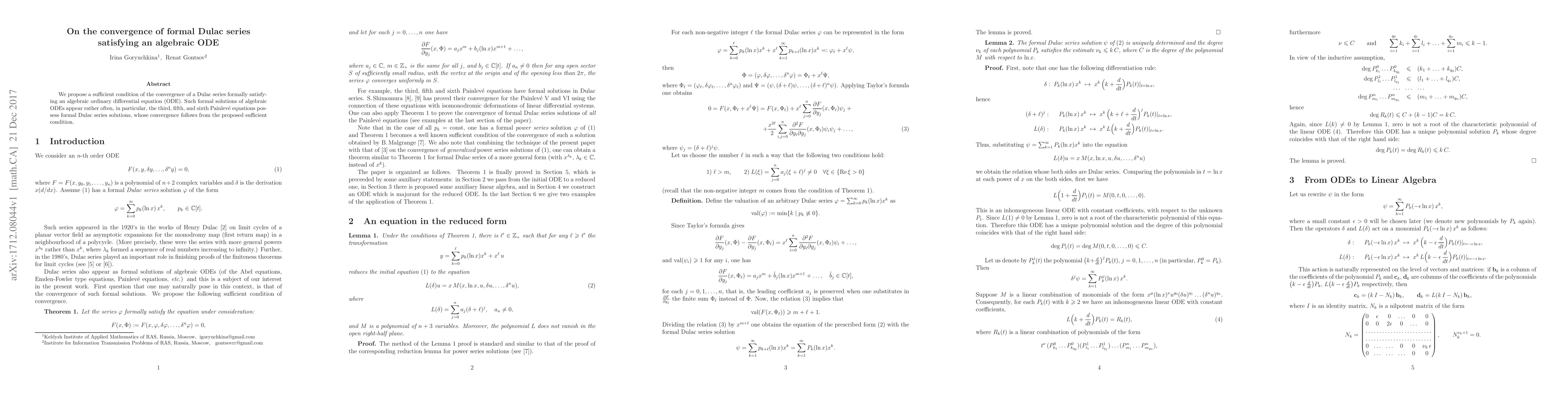 We propose a sufficient condition of the convergence of a Dulac series formally satisfying an algebraic ordinary differential equation (ODE). Such formal solutions of algebraic ODEs appear rather often, in particular, the third, fifth, and sixth Painlev\'e equations possess formal Dulac series solutions, whose convergence follows from the proposed sufficient condition.