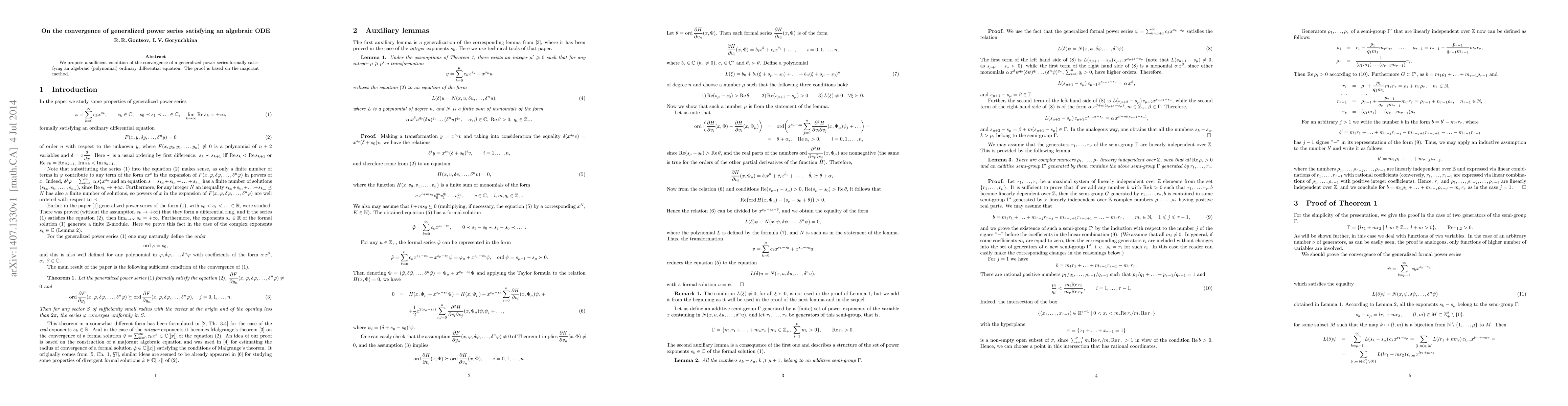Summary: This paper presents a sufficient condition for the convergence of generalized power series that satisfy an algebraic ordinary differential equation, utilizing the majorant method for proof.