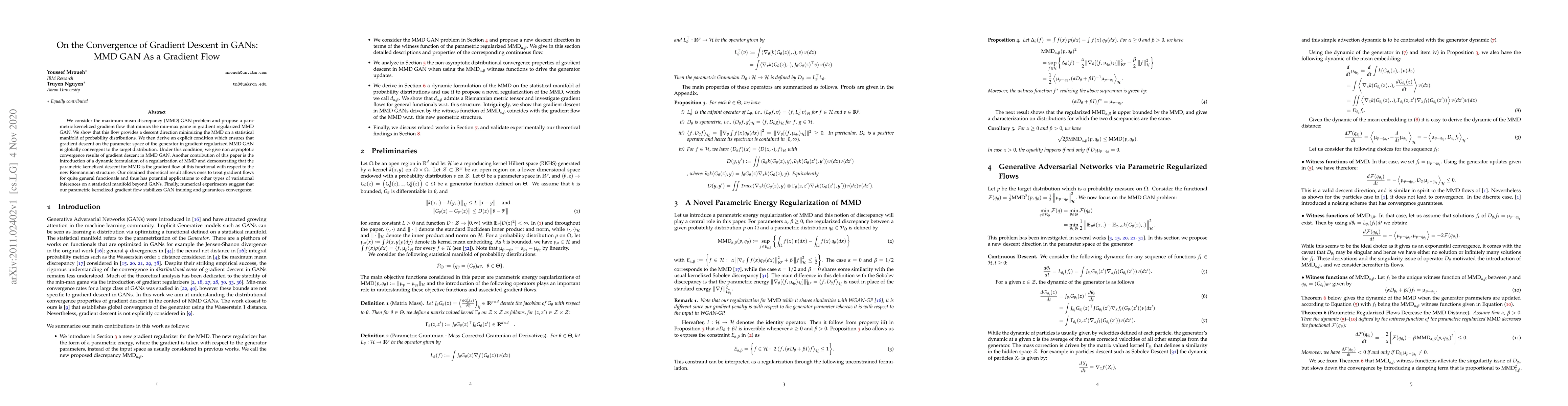 This paper proposes a parametric kernelized gradient flow for the MMD GAN problem, demonstrating its convergence to the target distribution under specific conditions. It also introduces a dynamic regularization of MMD and shows that the gradient flow is a descent direction on a statistical manifold, with potential applications beyond GANs.