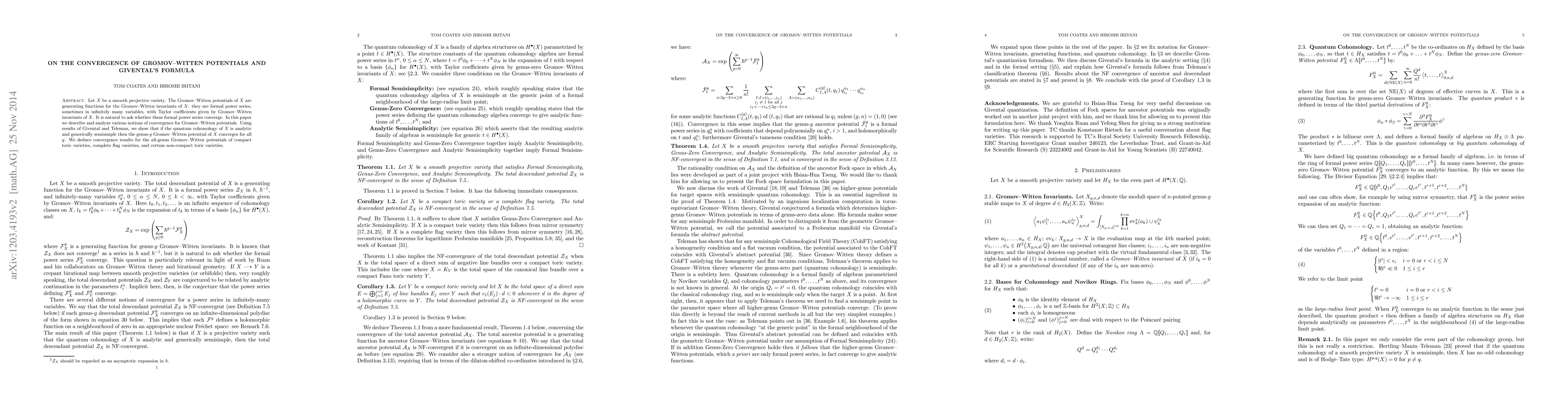 This paper investigates the convergence properties of Gromov-Witten potentials for smooth projective varieties, showing that under certain conditions on the quantum cohomology, these generating functions converge for all genera. It extends these results to specific types of varieties including toric and flag varieties.