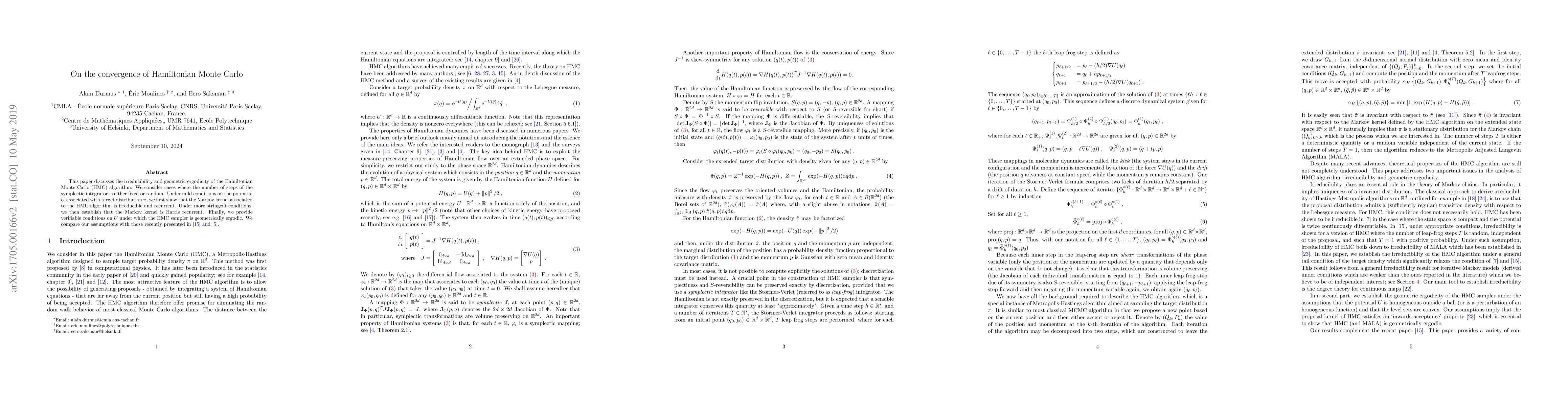 This paper discusses the irreducibility and geometric ergodicity of the Hamiltonian Monte Carlo (HMC) algorithm. We consider cases where the number of steps of the symplectic integrator is either fixed or random. Under mild conditions on the potential $\F$ associated with target distribution $\pi$, we first show that the Markov kernel associated to the HMC algorithm is irreducible and recurrent. Under more stringent conditions, we then establish that the Markov kernel is Harris recurrent. Finally, we provide verifiable conditions on $\F$ under which the HMC sampler is geometrically ergodic.