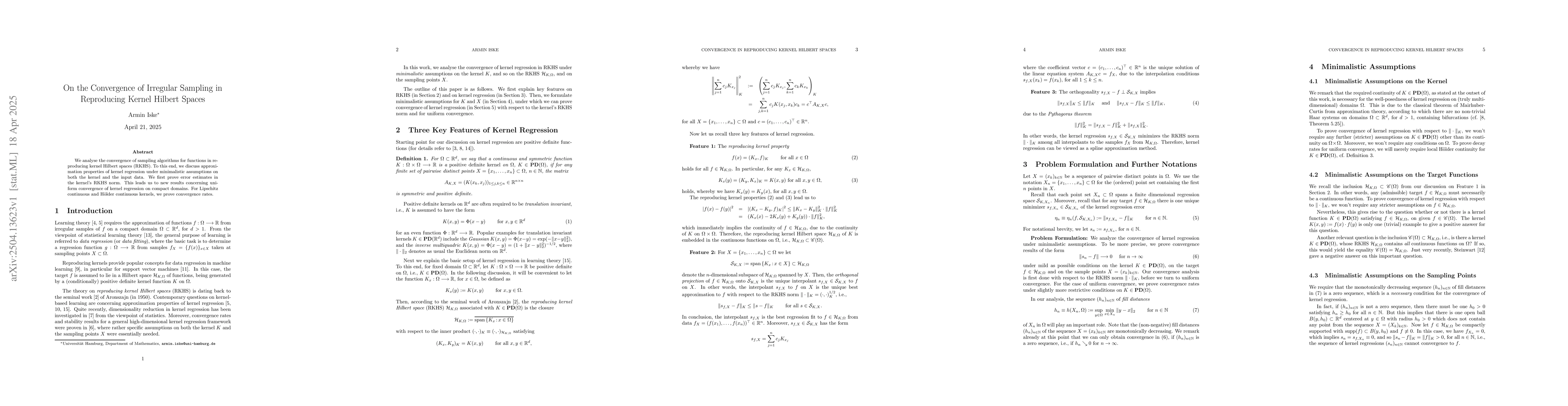 This paper investigates the convergence of sampling algorithms in reproducing kernel Hilbert spaces (RKHS), proving error estimates and uniform convergence for kernel regression under minimal assumptions. It also establishes convergence rates for Lipschitz continuous and H\"older continuous kernels.