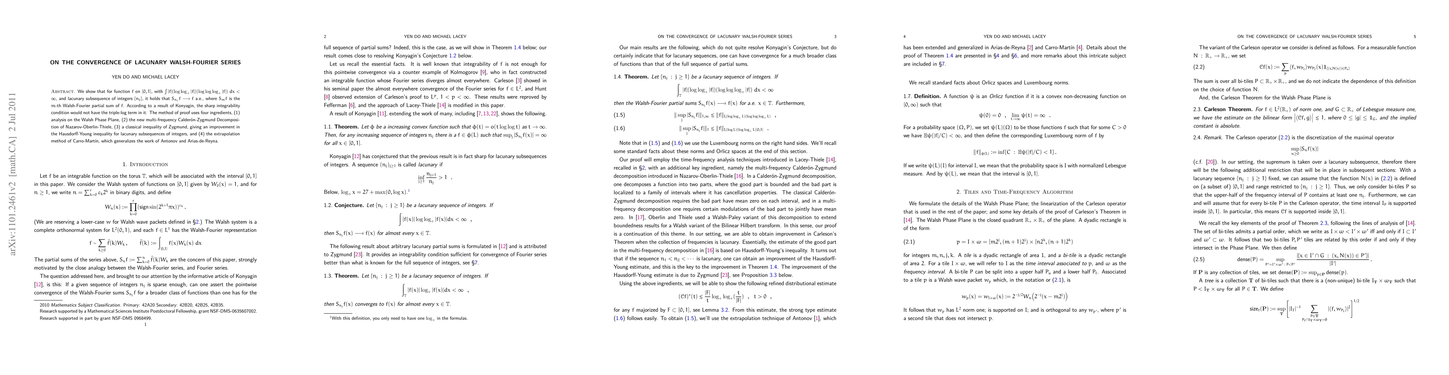 We study the Walsh-Fourier series of S_{n_j}f, along a lacunary subsequence of integers {n_j}. Under a suitable integrability condition, we show that the sequence converges to f a.e. Integral condition is only slightly larger than what the sharp integrability condition would be, by a result of Konyagin. The condition is: f is in L loglog L (logloglog L). The method of proof uses four ingredients, (1) analysis on the Walsh Phase Plane, (2) the new multi-frequency Calderon-Zygmund Decomposition of Nazarov-Oberlin-Thiele, (3) a classical inequality of Zygmund, giving an improvement in the Hausdorff-Young inequality for lacunary subsequences of integers, and (4) the extrapolation method of Carro-Martin, which generalizes the work of Antonov and Arias-de-Reyna.
