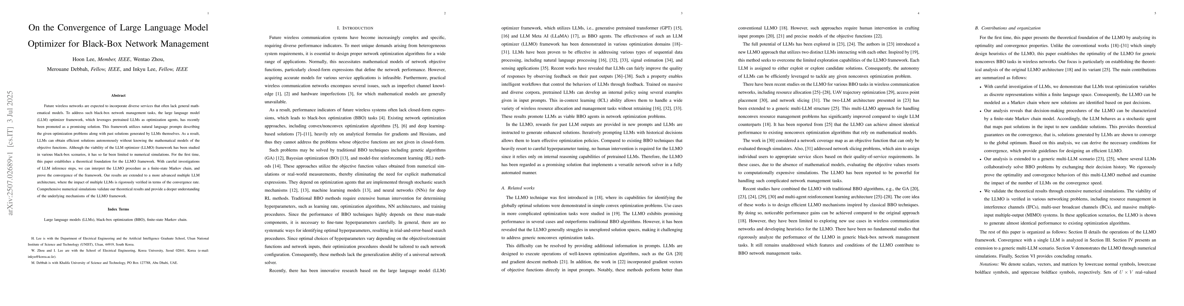 Future wireless networks are expected to incorporate diverse services that often lack general mathematical models. To address such black-box network management tasks, the large language model (LLM) optimizer framework, which leverages pretrained LLMs as optimization agents, has recently been promoted as a promising solution. This framework utilizes natural language prompts describing the given optimization problems along with past solutions generated by LLMs themselves. As a result, LLMs can obtain efficient solutions autonomously without knowing the mathematical models of the objective functions. Although the viability of the LLM optimizer (LLMO) framework has been studied in various black-box scenarios, it has so far been limited to numerical simulations. For the first time, this paper establishes a theoretical foundation for the LLMO framework. With careful investigations of LLM inference steps, we can interpret the LLMO procedure as a finite-state Markov chain, and prove the convergence of the framework. Our results are extended to a more advanced multiple LLM architecture, where the impact of multiple LLMs is rigorously verified in terms of the convergence rate. Comprehensive numerical simulations validate our theoretical results and provide a deeper understanding of the underlying mechanisms of the LLMO framework.