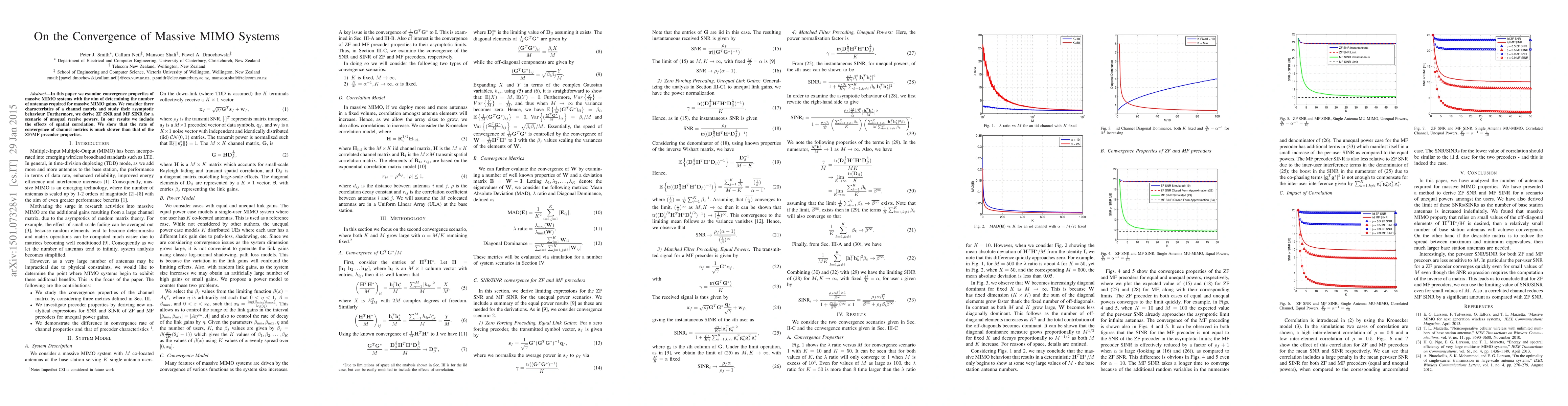 This paper investigates the convergence properties of massive MIMO systems to determine the minimum number of antennas required for significant gains. It analyzes the asymptotic behavior of channel matrix characteristics and derives ZF SNR and MF SINR under unequal receive powers, considering spatial correlation effects, and concludes that convergence rates of channel metrics lag behind those of precoder properties.