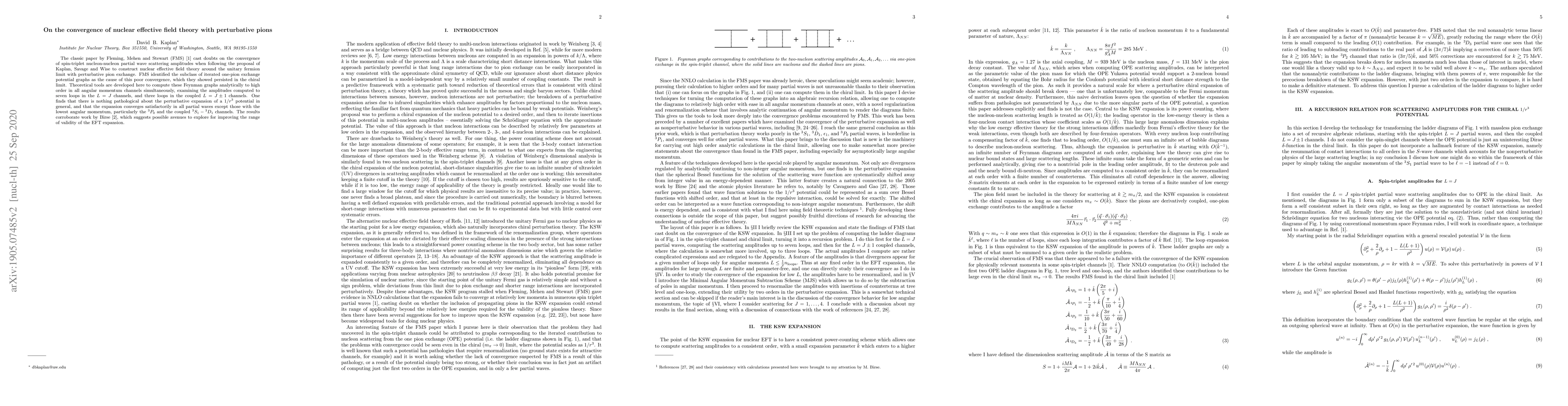 The classic paper by Fleming, Mehen and Stewart cast doubts on the convergence of spin-triplet nucleon-nucleon partial wave scattering amplitudes when following the proposal of Kaplan, Savage and Wise to construct nuclear effective field theory around the unitary fermion limit with perturbative pion exchange. FMS identified the subclass of iterated one-pion exchange potential graphs as the cause of this poor convergence, which they showed persisted in the chiral limit. Theoretical tools are developed here to compute these Feynman graphs analytically to high order in all angular momentum channels simultaneously, examining the amplitudes computed to seven loops in the $L=J$ channels, and three loops in the coupled $L=J\pm1$ channels. One finds that there is nothing pathological about the perturbative expansion of a $1/r^3$ potential in general, and that the expansion converges satisfactorily in all partial waves except those with the lowest angular momentum, particularly the ${}^3P_0$ and the coupled ${}^3S_1-{}^3D_1$ channels. The results corroborate work by Birse, which suggests possible avenues to explore for improving the range of validity of the EFT expansion.