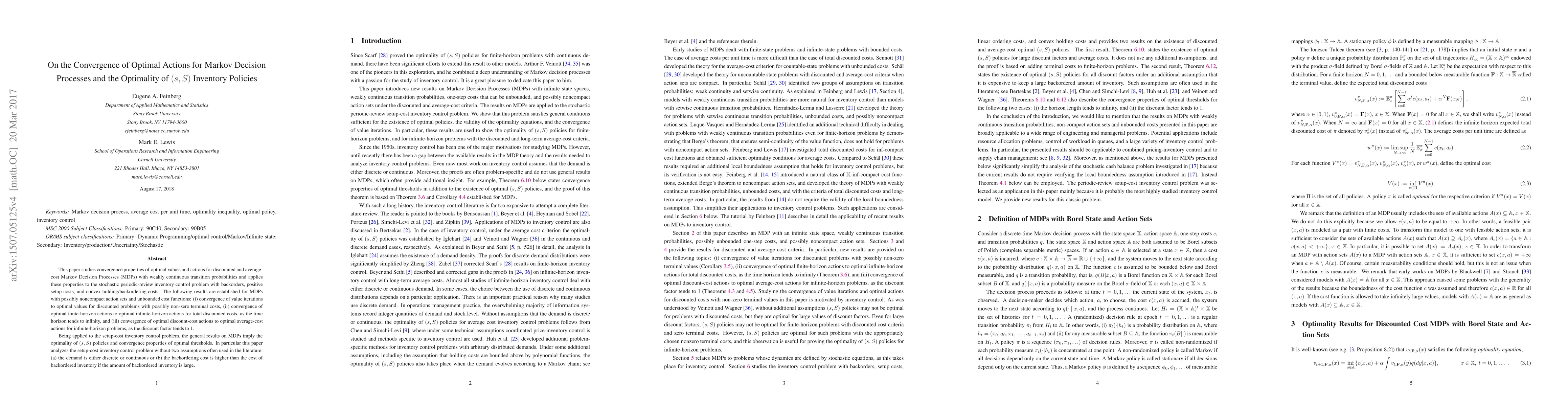 This paper investigates the convergence of optimal actions in Markov Decision Processes (MDPs) and applies these findings to inventory control, proving the optimality of $(s,S)$ policies without typical assumptions about demand or backordering costs. Key results include the convergence of value iterations, finite-horizon to infinite-horizon actions, and discount-cost to average-cost actions.