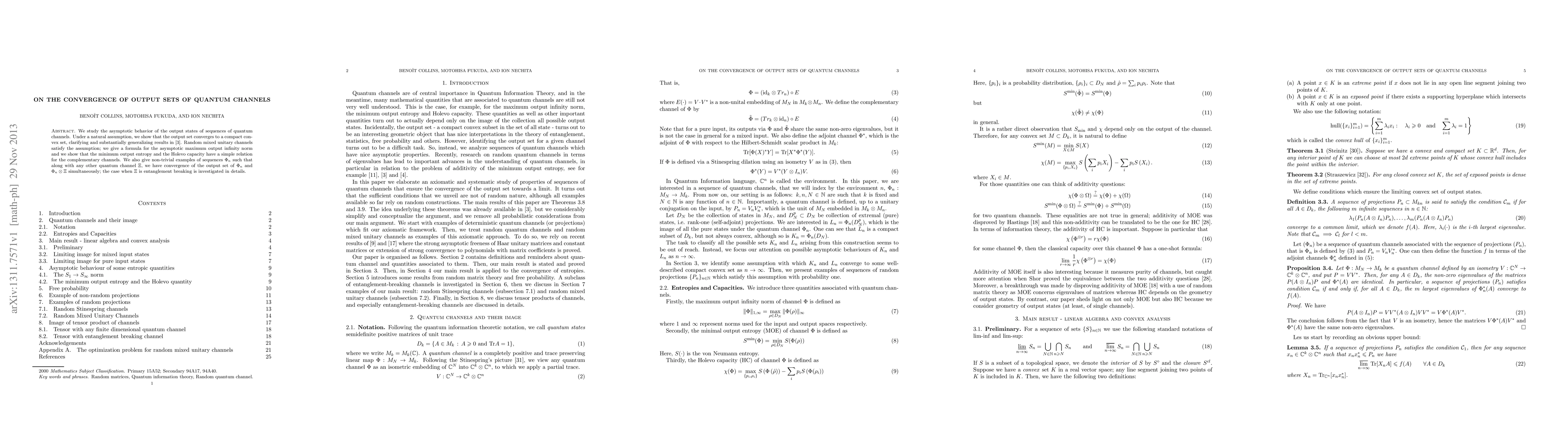 We study the asymptotic behavior of the output states of sequences of quantum channels. Under a natural assumption, we show that the output set converges to a compact convex set, clarifying and substantially generalizing results in [BCN13]. Random mixed unitary channels satisfy the assumption; we give a formula for the asymptotic maximum output infinity norm and we show that the minimum output entropy and the Holevo capacity have a simple relation for the complementary channels. We also give non-trivial examples of sequences $\Phi_n$ such that along with any other quantum channel $\Xi$, we have convergence of the output set of $\Phi_n$ and $\Phi_n\otimes \Xi$ simultaneously; the case when $\Xi$ is entanglement breaking is investigated in details.