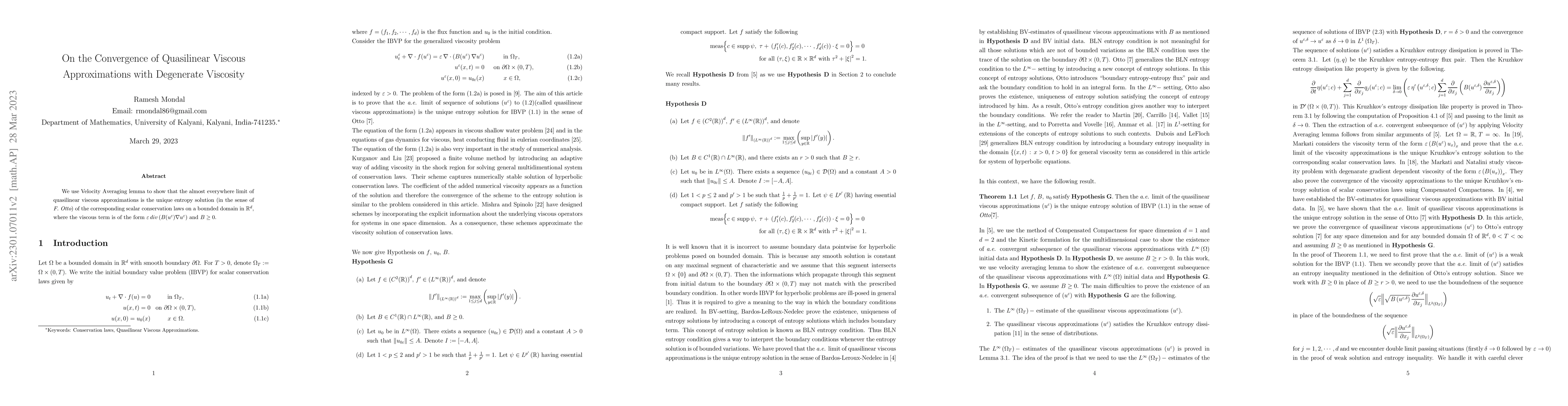 This paper demonstrates that quasilinear viscous approximations converge almost everywhere to the unique entropy solution of scalar conservation laws using the Velocity Averaging lemma, where the viscosity term is degenerate and positive semi-definite.
