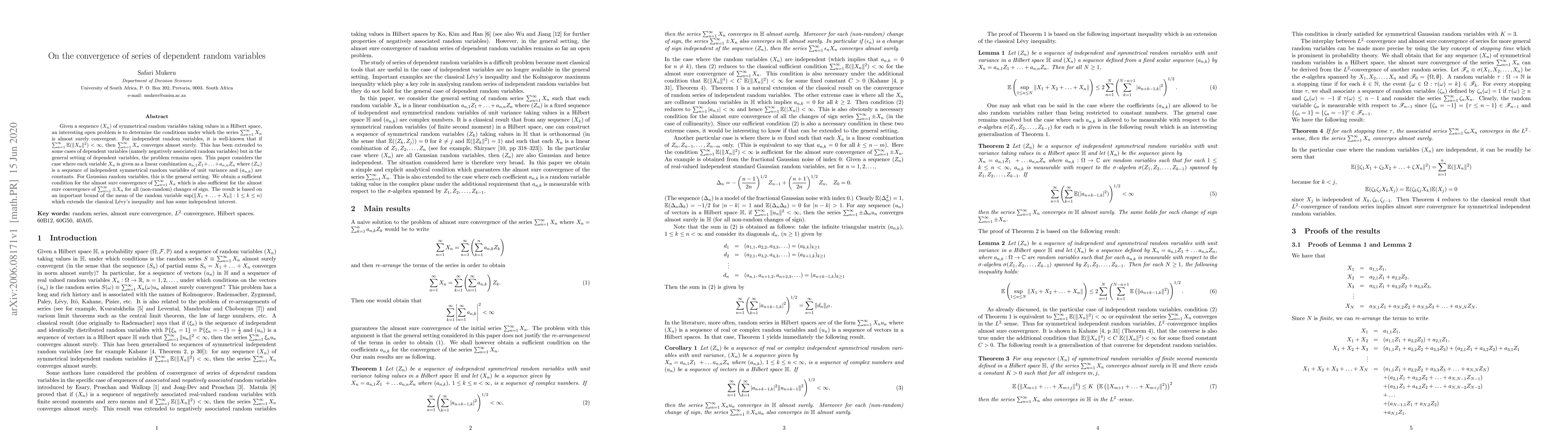 This paper explores the almost sure convergence of series $\sum_{n=1}^\infty X_n$ for a sequence of dependent symmetrical random variables in a Hilbert space. It establishes a sufficient condition for convergence based on a novel bound extending Lévy's inequality, applicable to Gaussian random variables and ensuring convergence for any sign changes.