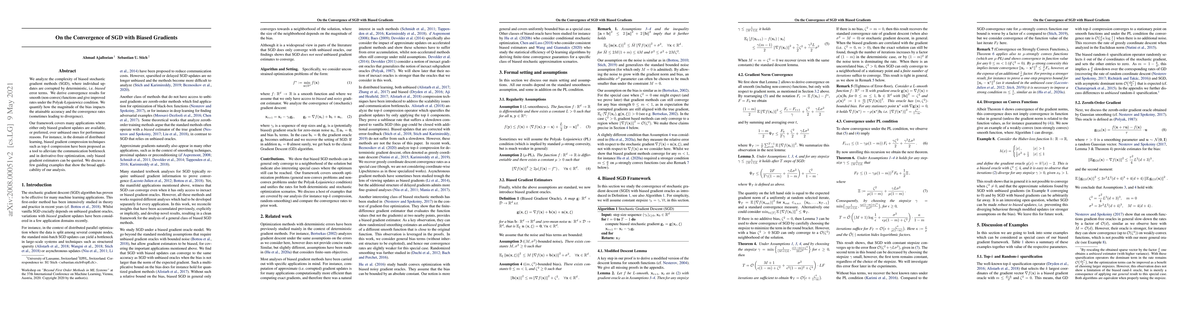 We analyze the complexity of biased stochastic gradient methods (SGD), where individual updates are corrupted by deterministic, i.e. biased error terms. We derive convergence results for smooth (non-convex) functions and give improved rates under the Polyak-Lojasiewicz condition. We quantify how the magnitude of the bias impacts the attainable accuracy and the convergence rates (sometimes leading to divergence). Our framework covers many applications where either only biased gradient updates are available, or preferred, over unbiased ones for performance reasons. For instance, in the domain of distributed learning, biased gradient compression techniques such as top-k compression have been proposed as a tool to alleviate the communication bottleneck and in derivative-free optimization, only biased gradient estimators can be queried. We discuss a few guiding examples that show the broad applicability of our analysis.