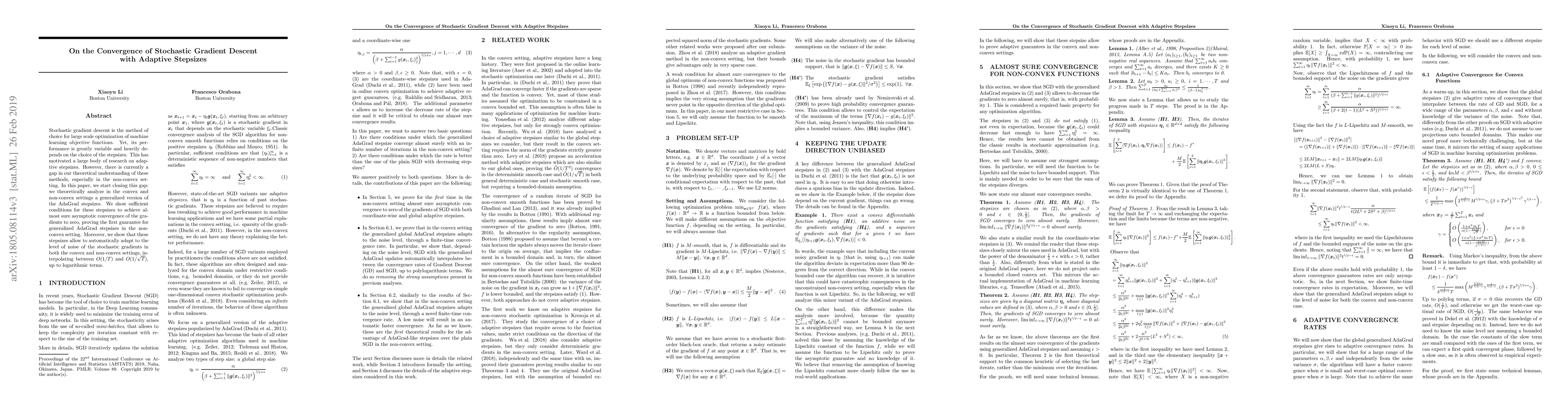 This paper theoretically analyzes adaptive stepsizes in stochastic gradient descent, particularly a generalized version of AdaGrad. It provides sufficient conditions for convergence in both convex and non-convex settings, offering the first guarantee for non-convex scenarios, and demonstrates adaptive noise level handling.