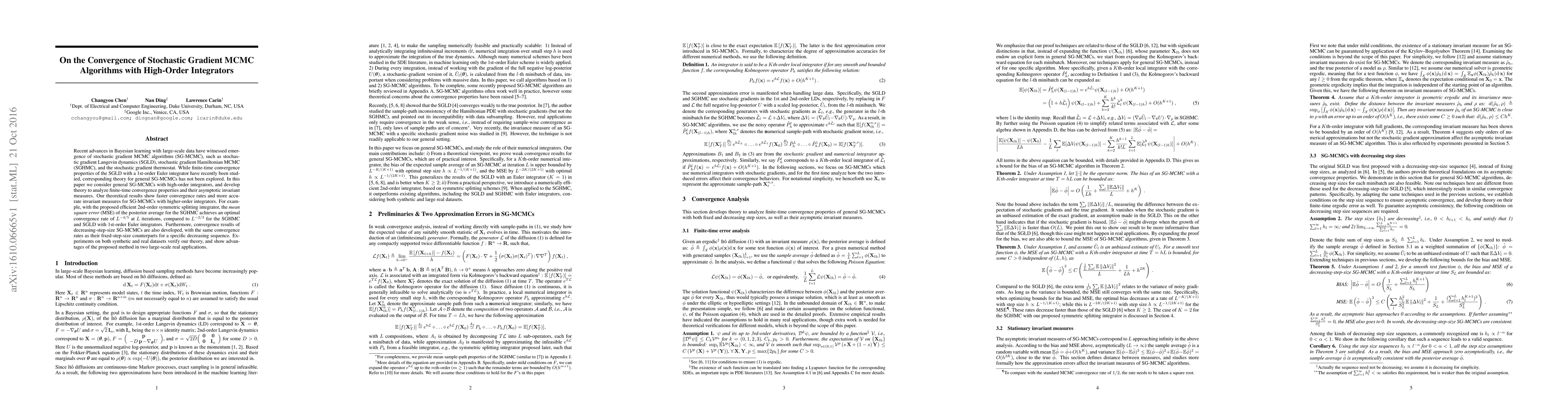 Recent advances in Bayesian learning with large-scale data have witnessed emergence of stochastic gradient MCMC algorithms (SG-MCMC), such as stochastic gradient Langevin dynamics (SGLD), stochastic gradient Hamiltonian MCMC (SGHMC), and the stochastic gradient thermostat. While finite-time convergence properties of the SGLD with a 1st-order Euler integrator have recently been studied, corresponding theory for general SG-MCMCs has not been explored. In this paper we consider general SG-MCMCs with high-order integrators, and develop theory to analyze finite-time convergence properties and their asymptotic invariant measures. Our theoretical results show faster convergence rates and more accurate invariant measures for SG-MCMCs with higher-order integrators. For example, with the proposed efficient 2nd-order symmetric splitting integrator, the {\em mean square error} (MSE) of the posterior average for the SGHMC achieves an optimal convergence rate of $L^{-4/5}$ at $L$ iterations, compared to $L^{-2/3}$ for the SGHMC and SGLD with 1st-order Euler integrators. Furthermore, convergence results of decreasing-step-size SG-MCMCs are also developed, with the same convergence rates as their fixed-step-size counterparts for a specific decreasing sequence. Experiments on both synthetic and real datasets verify our theory, and show advantages of the proposed method in two large-scale real applications.