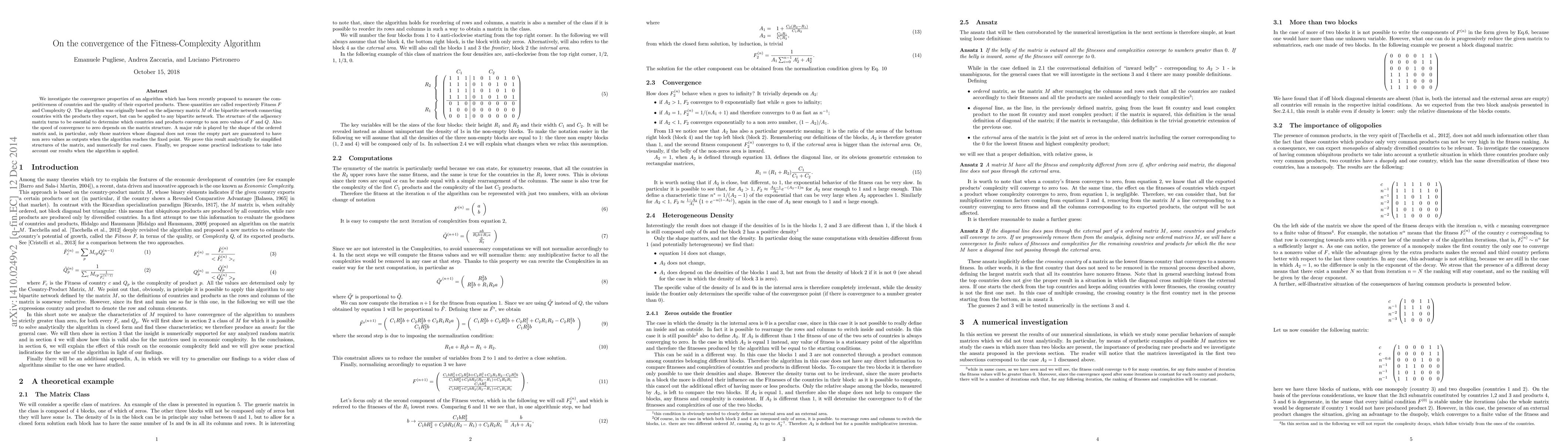 We investigate the convergence properties of an algorithm which has been recently proposed to measure the competitiveness of countries and the quality of their exported products. These quantities are called respectively Fitness F and Complexity Q. The algorithm was originally based on the adjacency matrix M of the bipartite network connecting countries with the products they export, but can be applied to any bipartite network. The structure of the adjacency matrix turns to be essential to determine which countries and products converge to non zero values of F and Q. Also the speed of convergence to zero depends on the matrix structure. A major role is played by the shape of the ordered matrix and, in particular, only those matrices whose diagonal does not cross the empty part are guaranteed to have non zero values as outputs when the algorithm reaches the fixed point. We prove this result analytically for simplified structures of the matrix, and numerically for real cases. Finally, we propose some practical indications to take into account our results when the algorithm is applied.