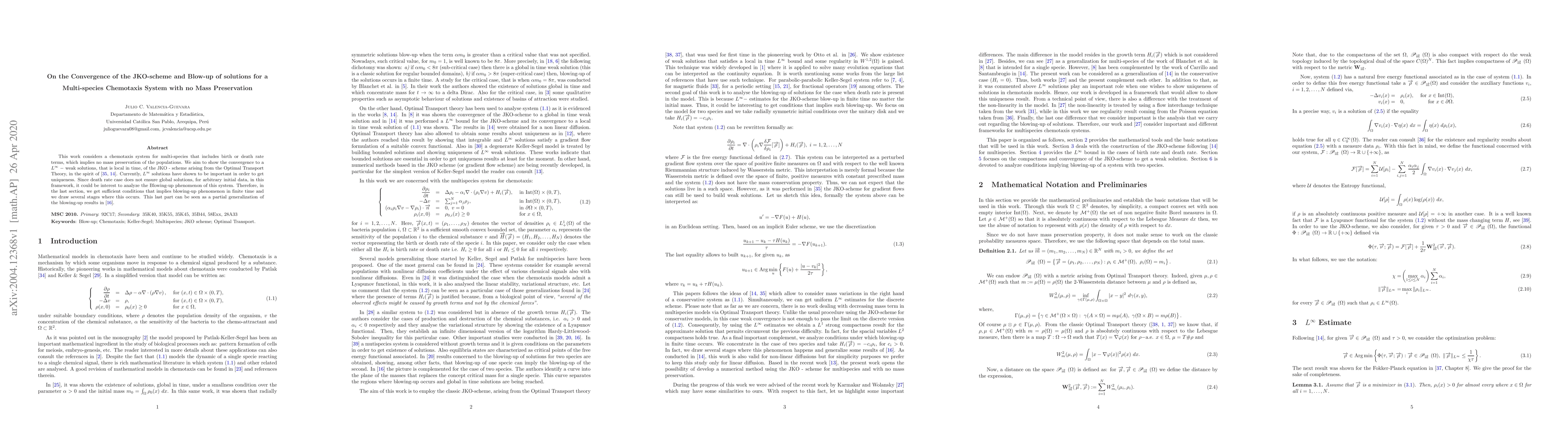 This work considers a chemotaxis system for multi-species that includes birth or death rate terms, which implies no mass preservation of the populations. We aim to show the convergence to a $L^{\infty}\ -\ $weak solutions, that is local in time, of the JKO - scheme arising from the Optimal Transport Theory, in the spirit of [35,14]. Currently, $L^{\infty}$ solutions have shown to be important in order to get uniqueness. Since death rate case does not ensure global solutions, for arbitrary initial data, in this framework, it could be interest to analyze the Blowing-up phenomenon of this system. Therefore, in the last section, we get sufficient conditions that implies blowing-up phenomenon in finite time and we draw several stages where this occurs. This last part can be seen as a partial generalization of the blowing-up results in [16].