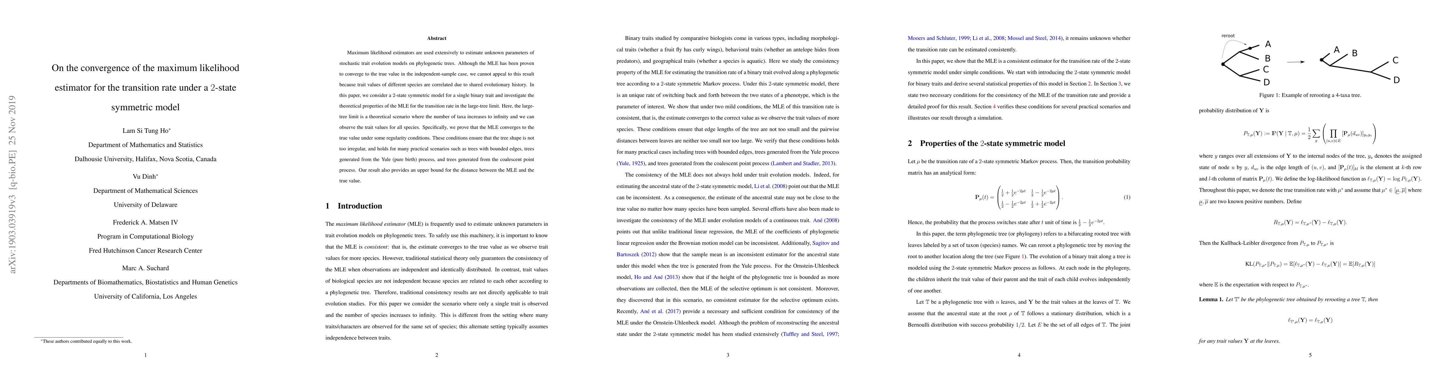 This paper investigates the convergence of the maximum likelihood estimator (MLE) for the transition rate in a 2-state symmetric model for binary traits under phylogenetic trees. It proves that the MLE converges to the true value in the large-tree limit, under conditions ensuring tree shape regularity, applicable to many practical scenarios.