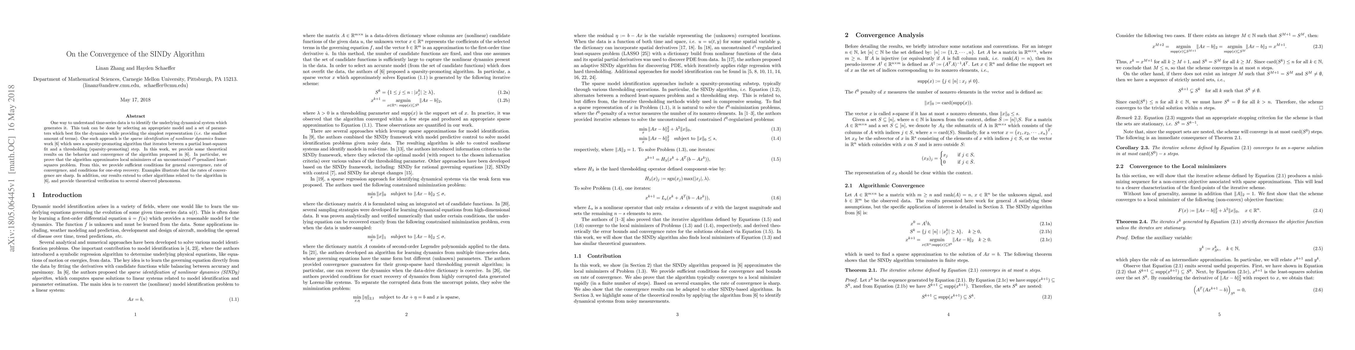 One way to understand time-series data is to identify the underlying dynamical system which generates it. This task can be done by selecting an appropriate model and a set of parameters which best fits the dynamics while providing the simplest representation (i.e. the smallest amount of terms). One such approach is the sparse identification of nonlinear dynamics framework [6] which uses a sparsity-promoting algorithm that iterates between a partial least-squares fit and a thresholding (sparsity-promoting) step. In this work, we provide some theoretical results on the behavior and convergence of the algorithm proposed in [6]. In particular, we prove that the algorithm approximates local minimizers of an unconstrained $\ell^0$-penalized least-squares problem. From this, we provide sufficient conditions for general convergence, rate of convergence, and conditions for one-step recovery. Examples illustrate that the rates of convergence are sharp. In addition, our results extend to other algorithms related to the algorithm in [6], and provide theoretical verification to several observed phenomena.